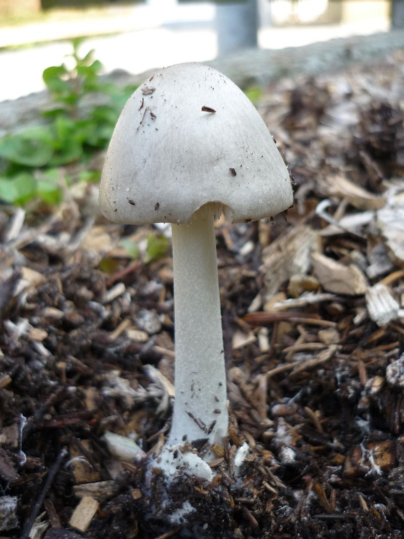 1. Der erste stand genaugenommen im Nachbargarten zwischen den Häckseln, wo im Sommer die Braunkappen wuchsen - Große Scheidlinge (Volvariella Gloiocephala)? Hut grau, Hutdurchmesser ca. 3 cm, aus einer Art Scheide wachsend.