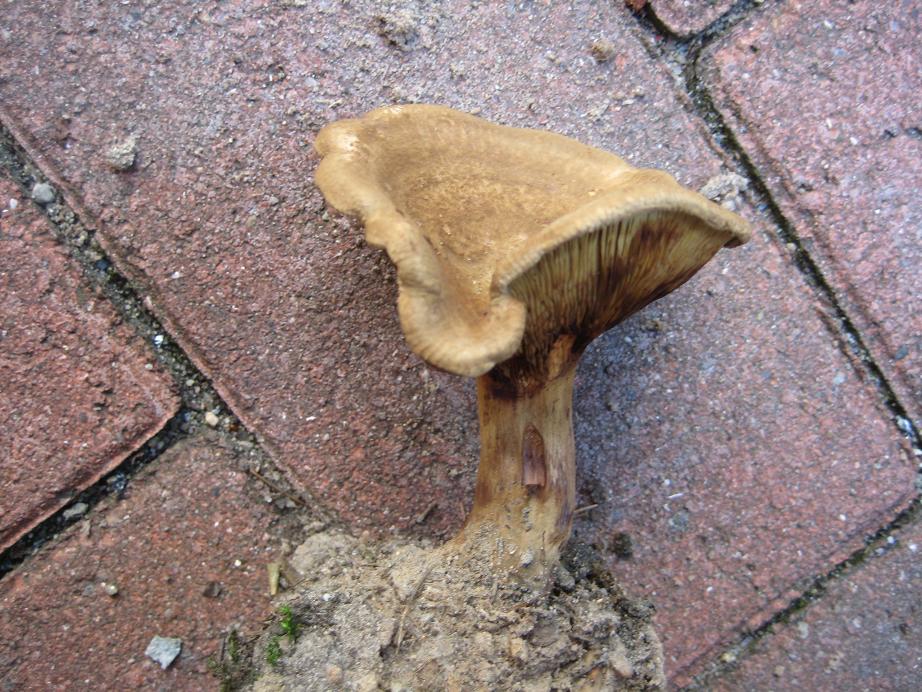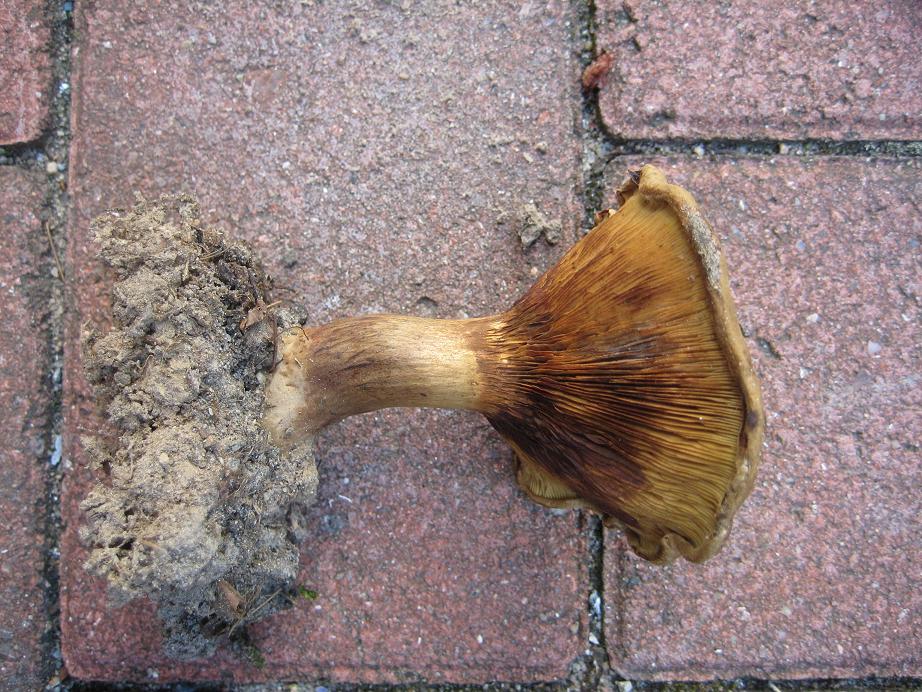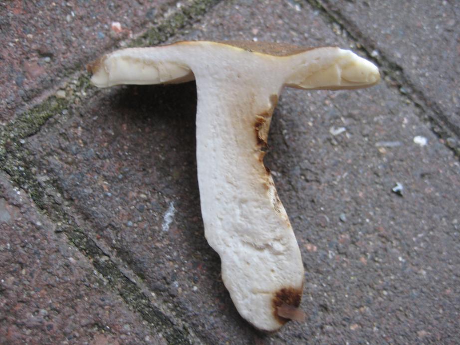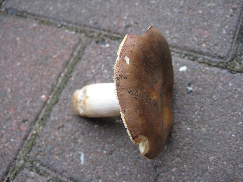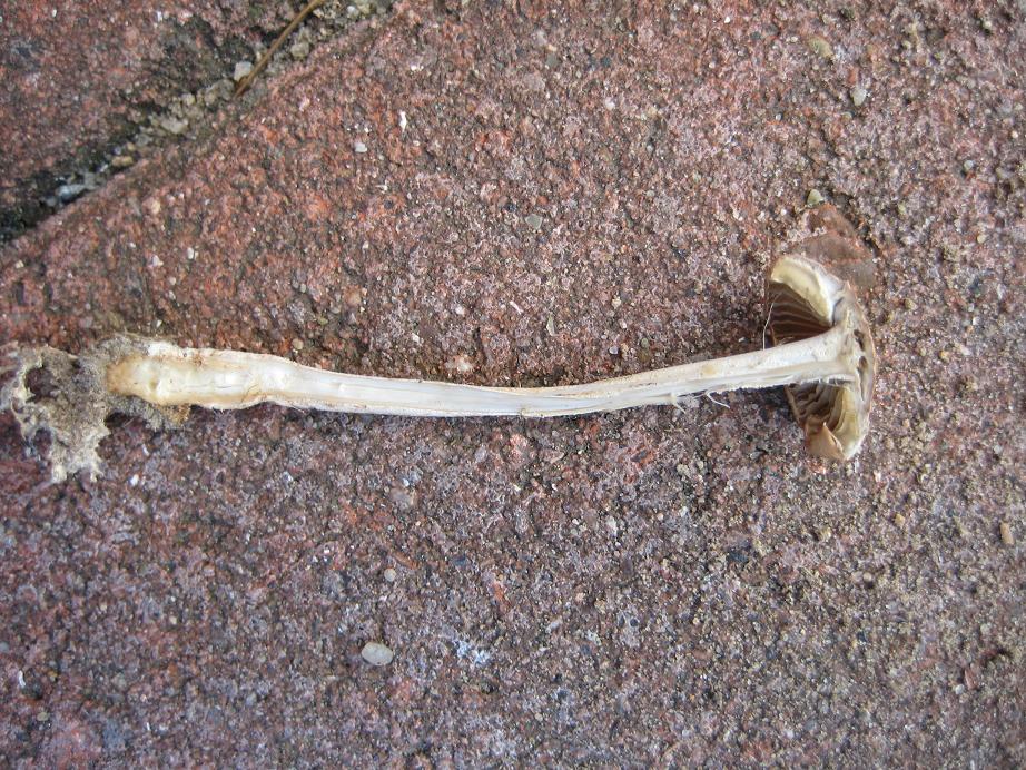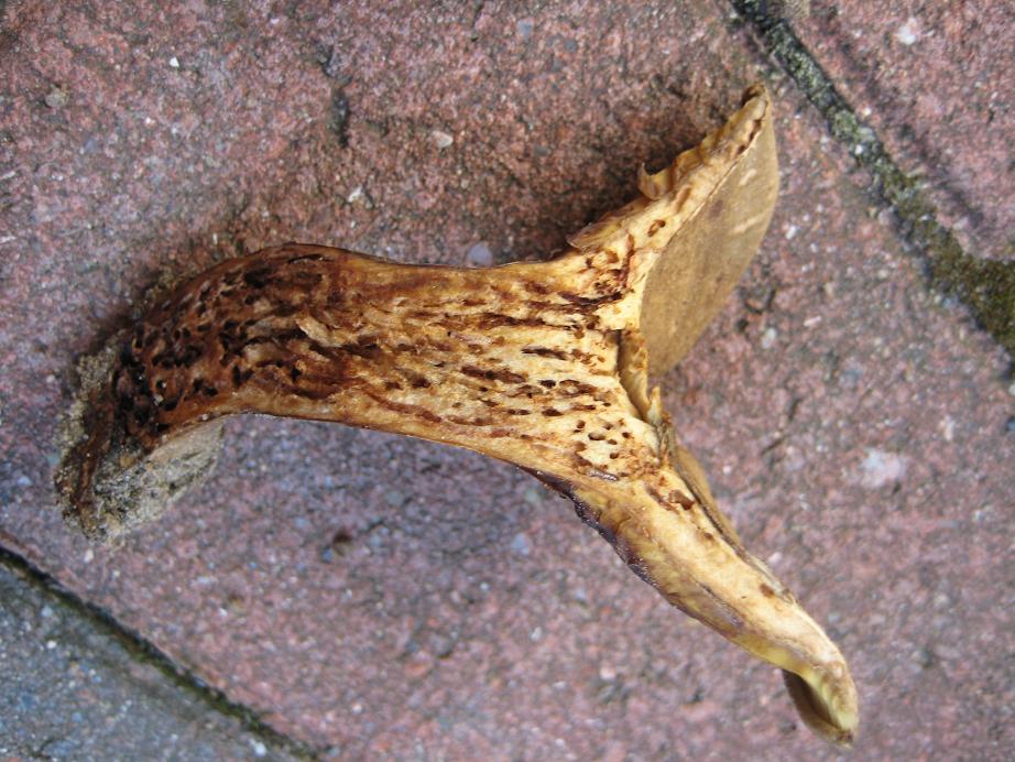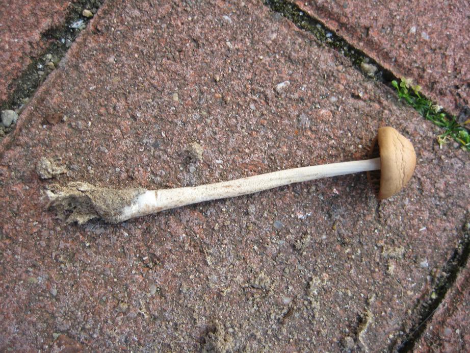 Hutdurchmesser ca. 2 cm, dunkelbraun, Hutoberfläche unregelmäßig, faseriger Stiel, braune Lamellen.