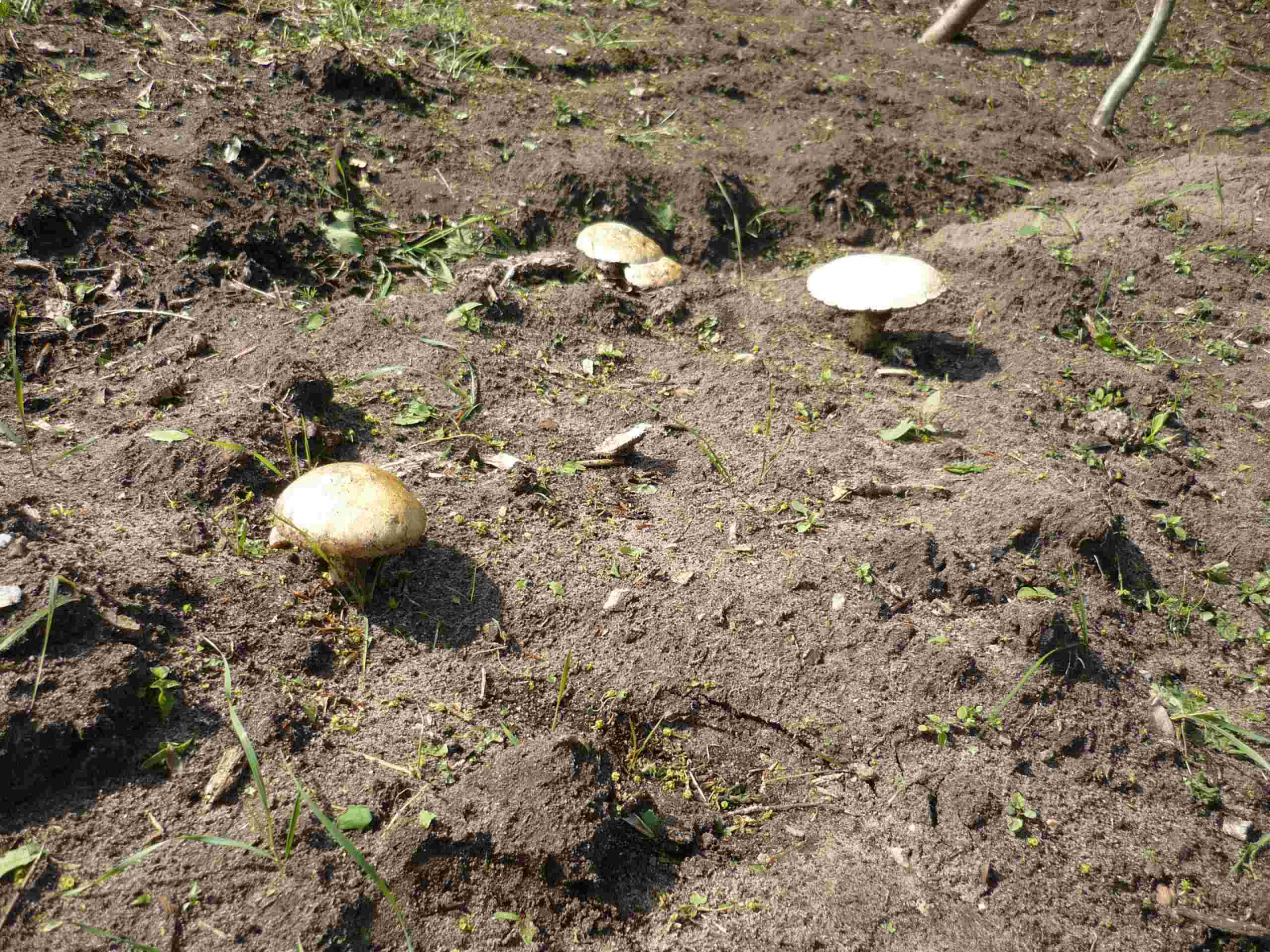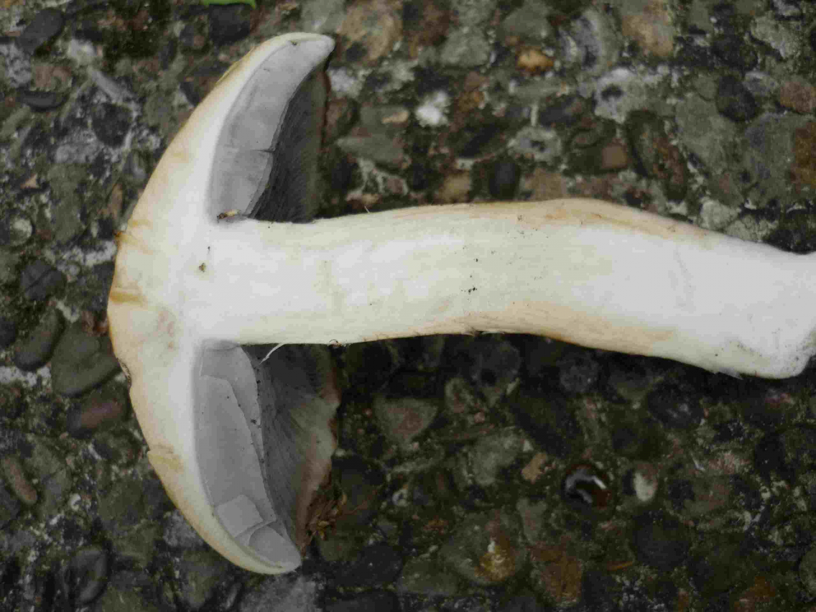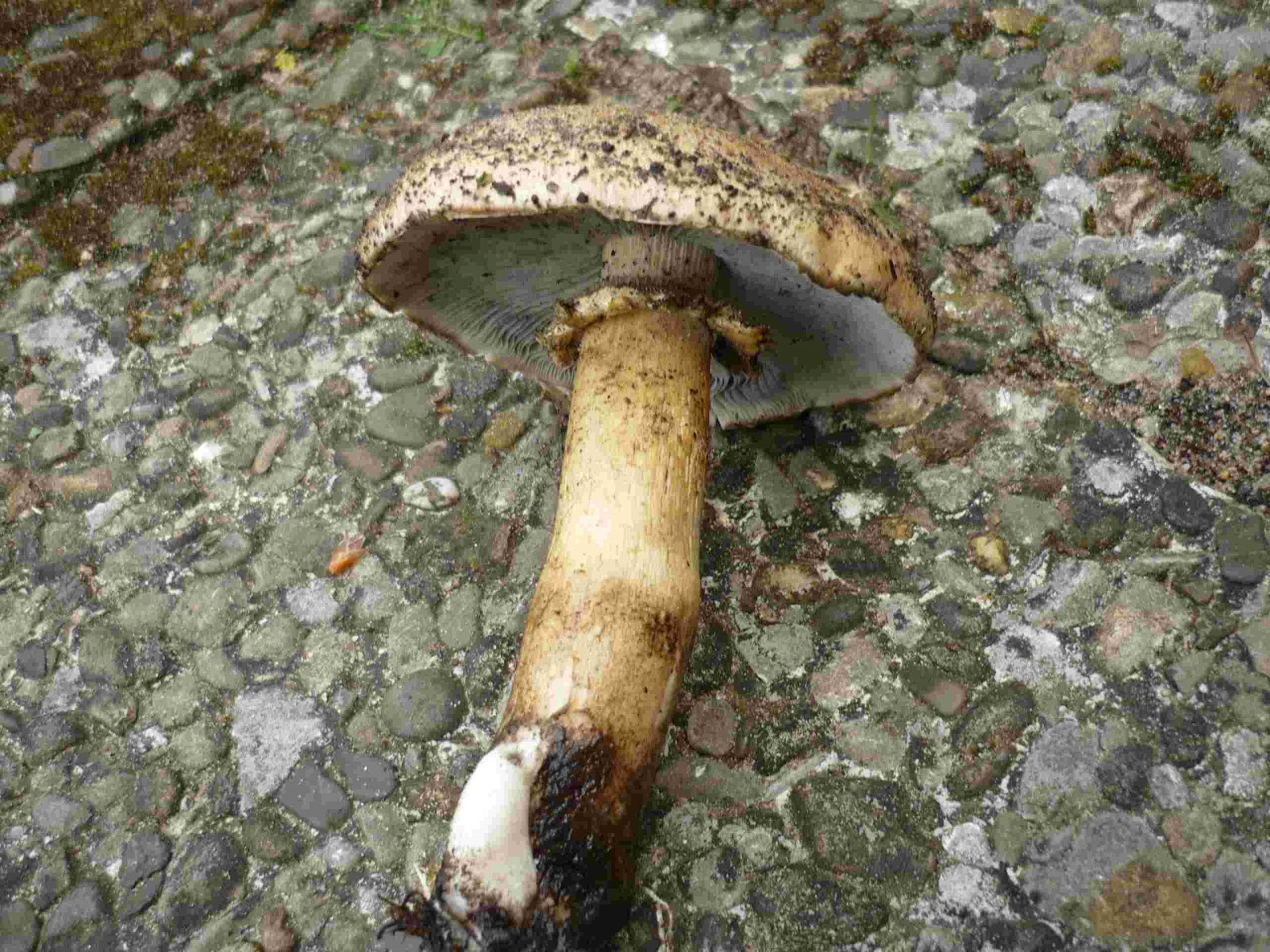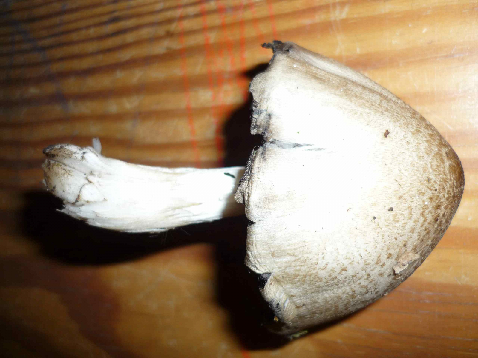 Der Stiel ist dünn, Durchmesser ca. 4 cm. Nahe des Hutes ist der Stiel weiß, weiter unten gelblich-braun gesprenkelt, die Beschaffenheit des Stiels ist uneben. Der Hut ist hellbraun, Durchmesser etwas über 2 cm. Lamellen beigegrau. Geruch nicht sehr ausgeprägt - mehlartig?