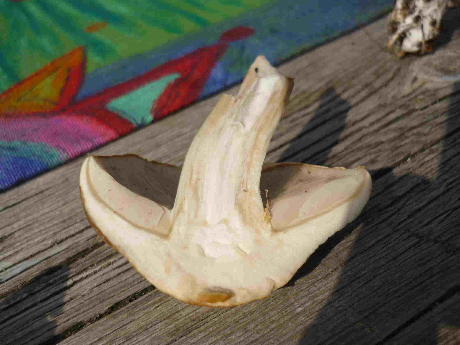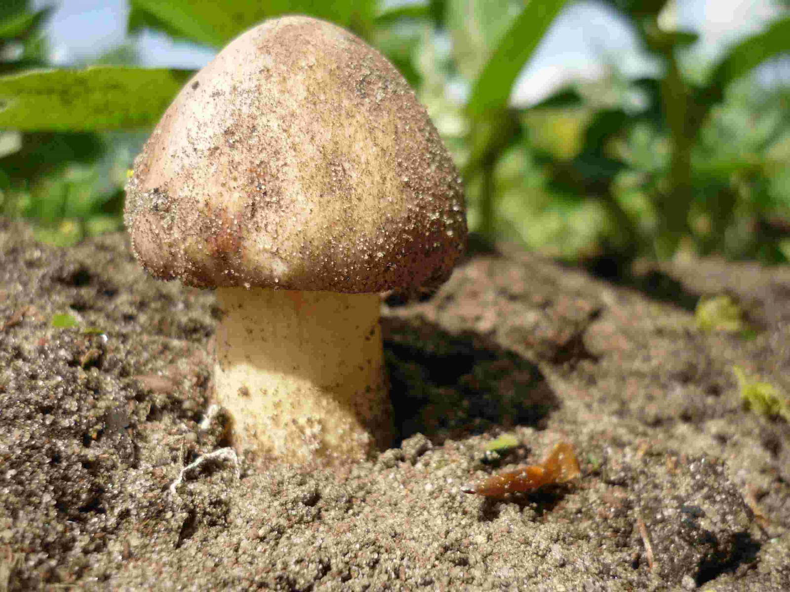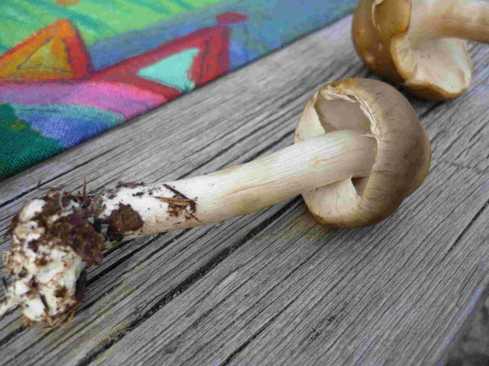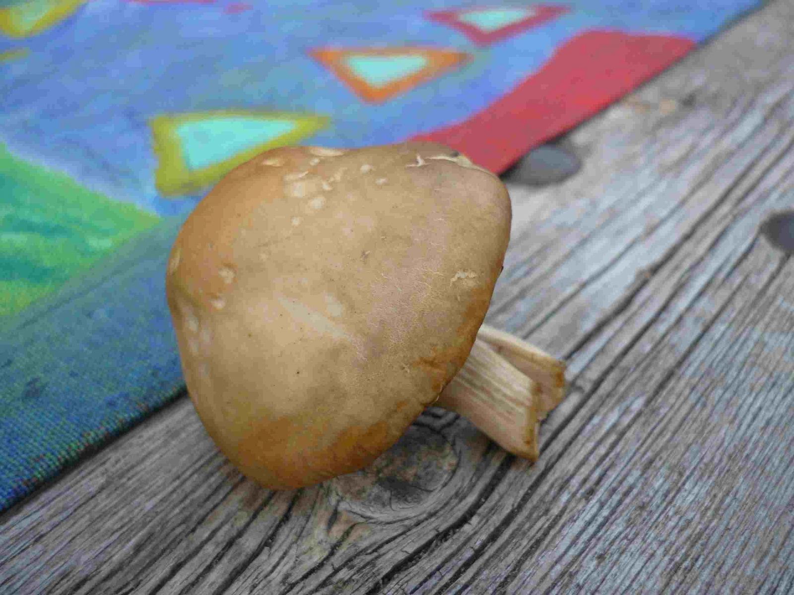 Der Stiel ist dünn, Durchmesser ca. 4 cm. Nahe des Hutes ist der Stiel weiß, weiter unten gelblich-braun gesprenkelt, die Beschaffenheit des Stiels ist uneben. Der Hut ist hellbraun, Durchmesser etwas über 2 cm. Lamellen beigegrau. Geruch nicht sehr ausgeprägt - mehlartig?