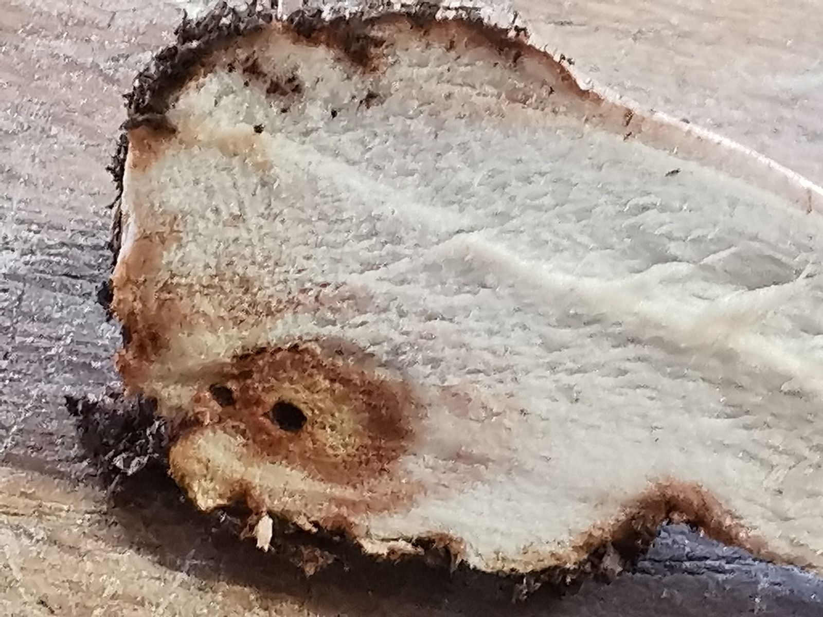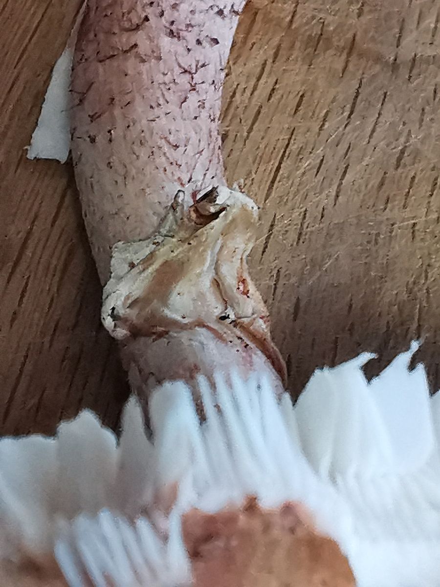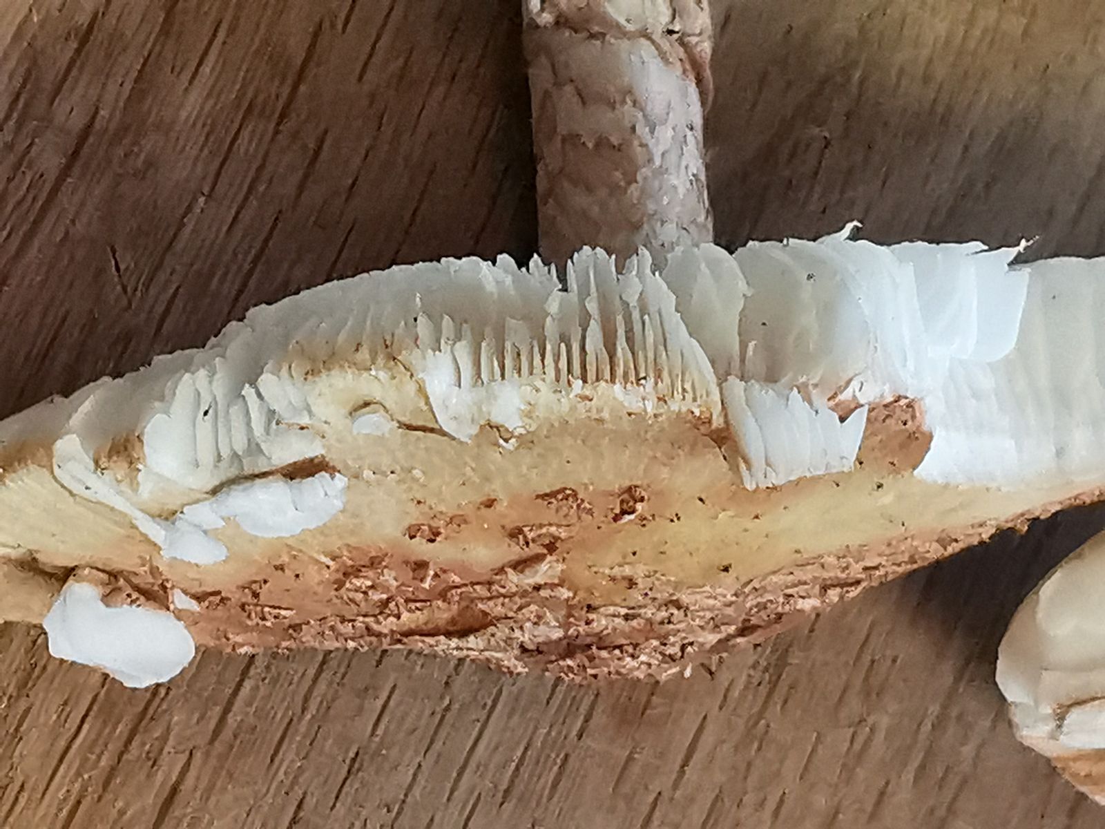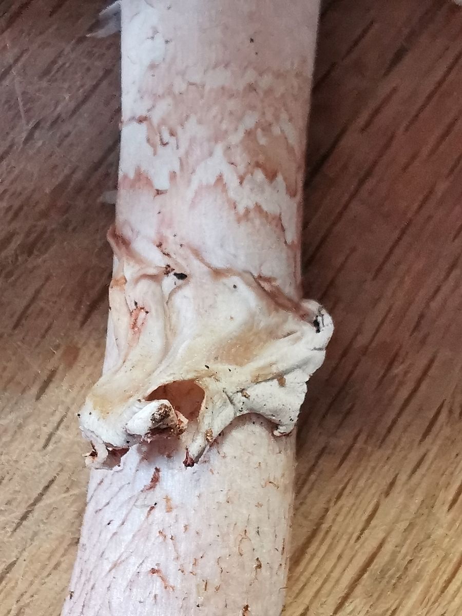 Ca 6 cm in der Länge, dünner Stiel. Innen gelb, außen rötlich. Faserig.