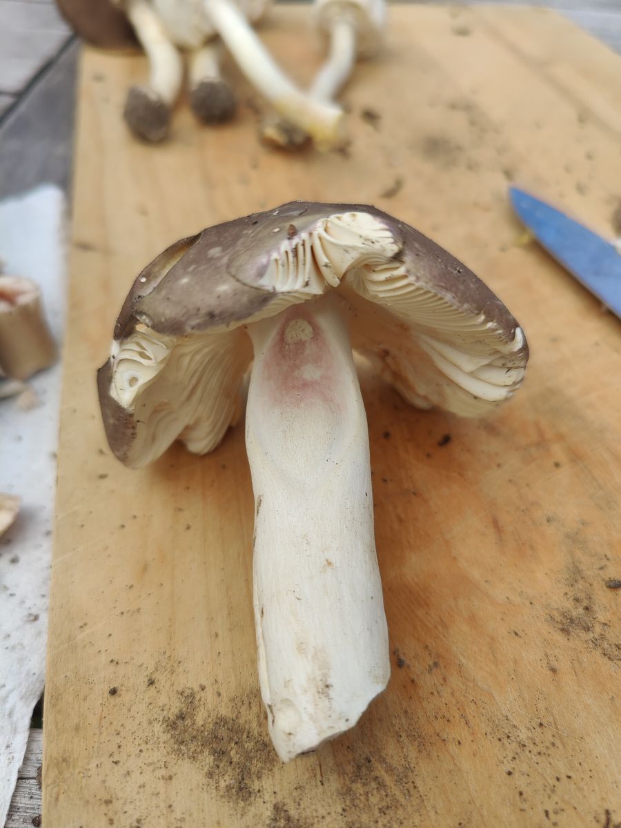 Moin, ich habe in einem Buchenmischwald sowohl Perl- als auch Pantherpilze gefunden. Dieses Exemplar hielt ich im Wald aufgrund der leichten Rottöne und des fehlenden Bergsteigersöckchens für einen Perlpilz. Der Ring ist außerdem gerieft. Nun verunsichert mich aber, dass kein einziger roter Madengang vorhanden ist und die Schnittfläche auch nach 15 min nicht rot wird. Wie ist eure Meinung?