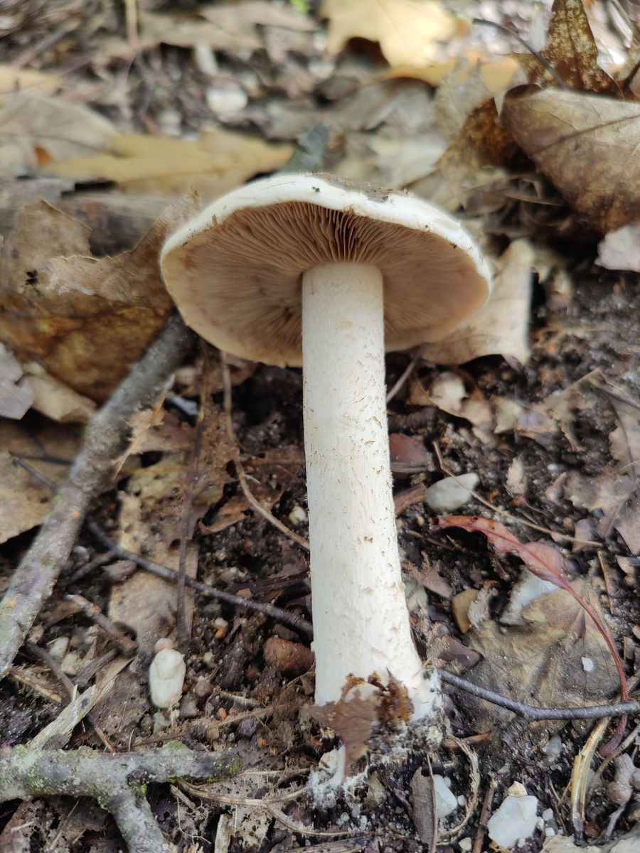 Ich würde am ehesten schon auf einen Perlpilz tippen, aber ganz sicher bin ich mir nicht, ich würde vom Verzehr unbedingt abraten.