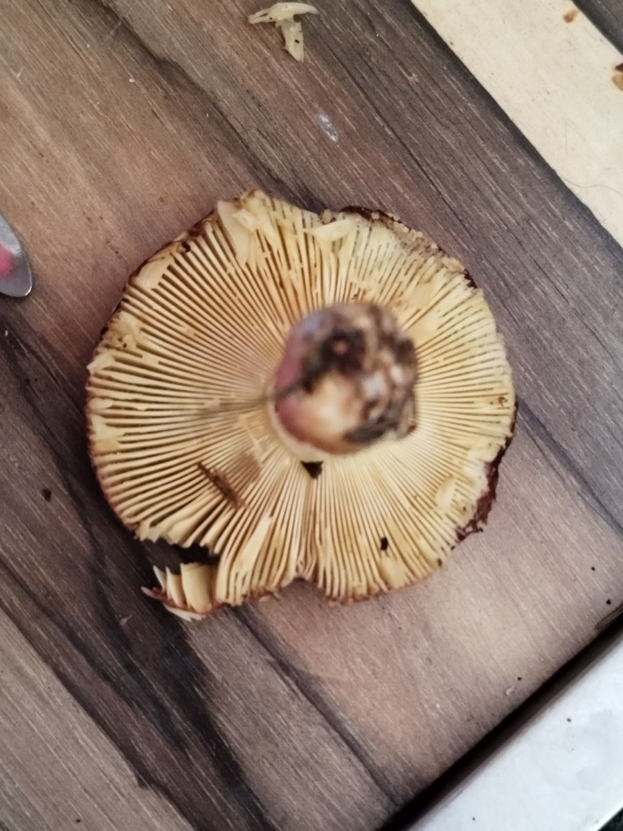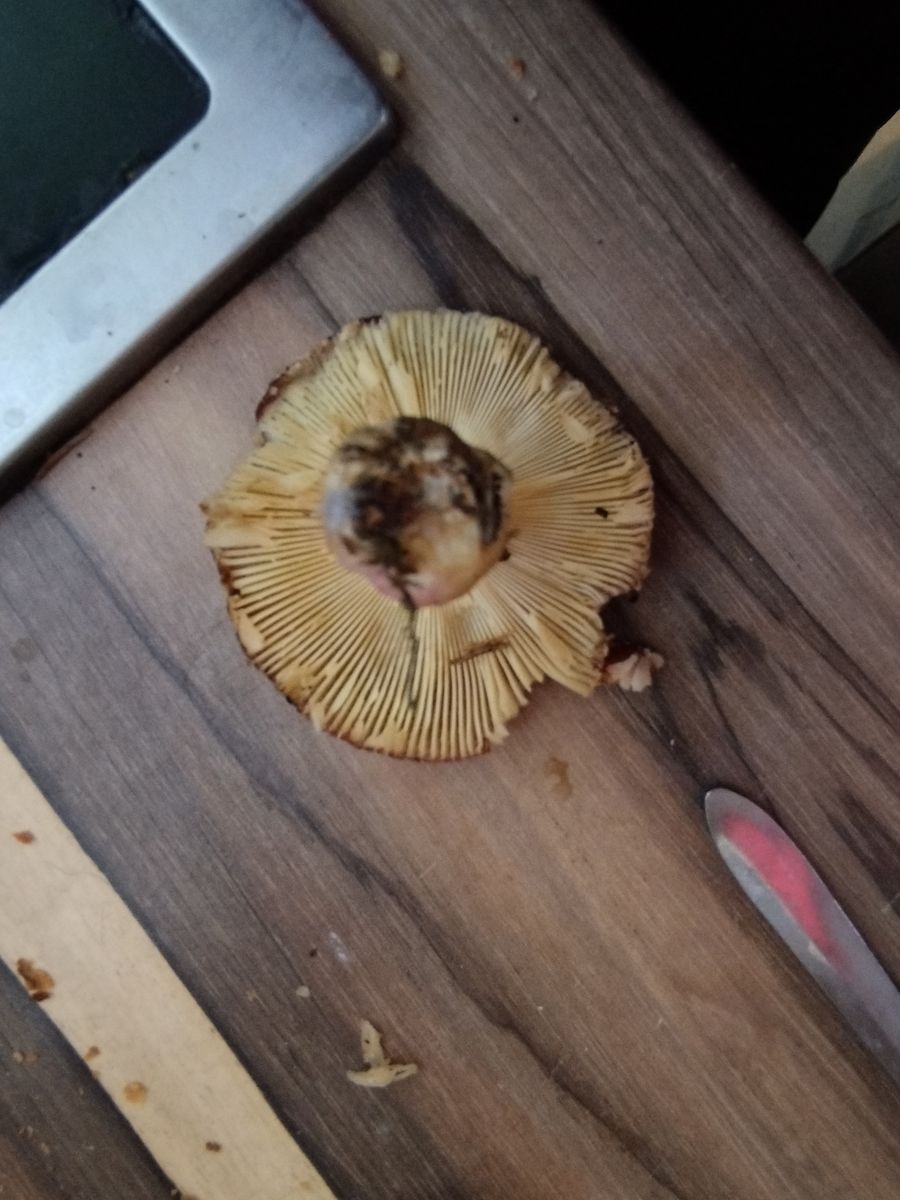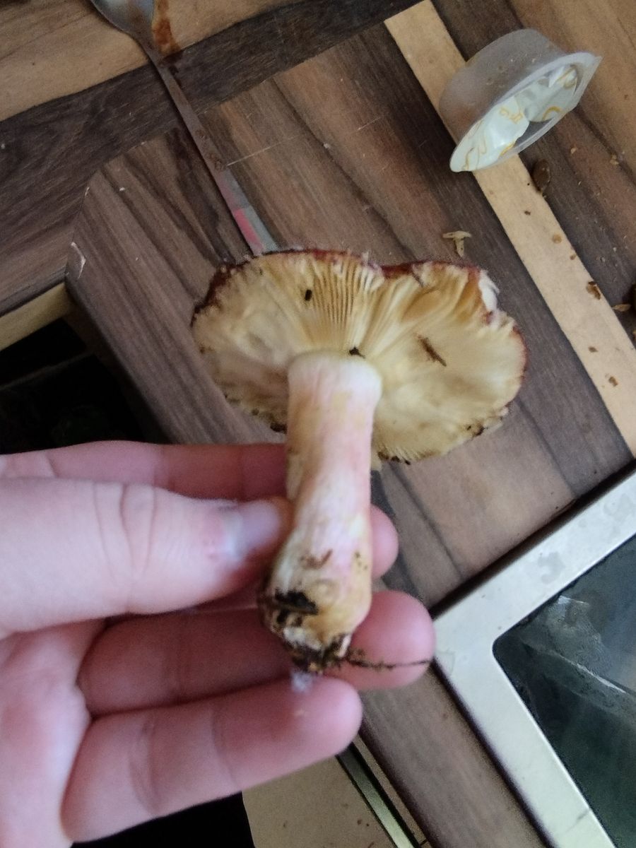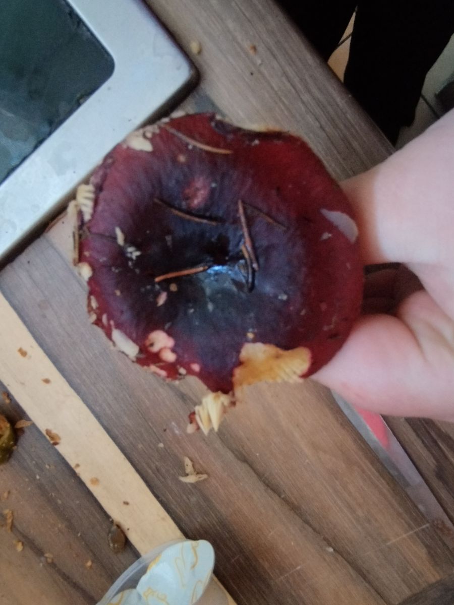 Hallo, riech doch mal an der Stielbasis. Die sollte ein bisschen nach Stachelbeerkompott riechen. Dann wäre es der Stachelbeertäubling. Es kann aber auch eine andere Art aus der Gattung der Täubling sein. Die ist ziemlich kompliziert.