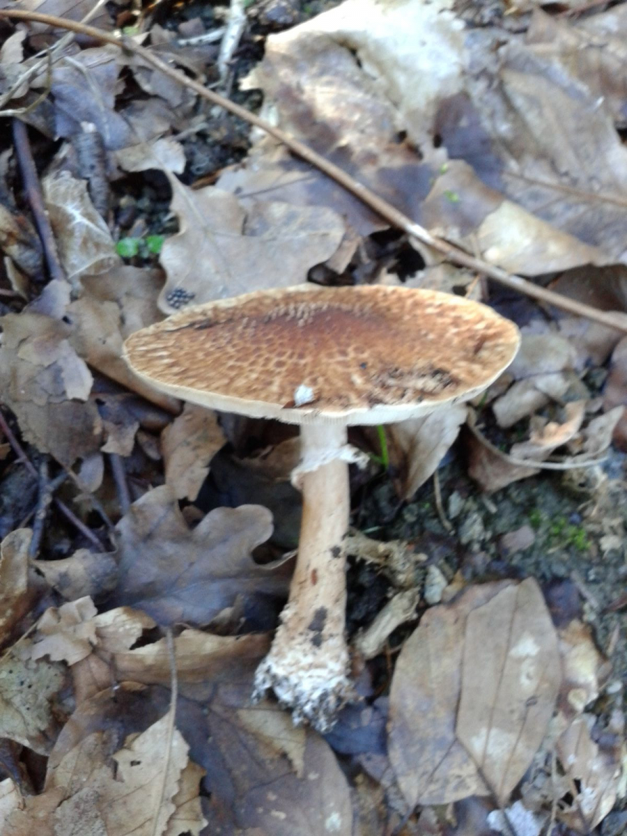 Die roten Stellen am Fuß deuten nach dem Pilzbuch auf den Perlpilz hin, aber die sehr dunkle Farbe macht mich stutzig, gibt es in der Gestalt eine größere Anzahl unterschiedlicher Arten?