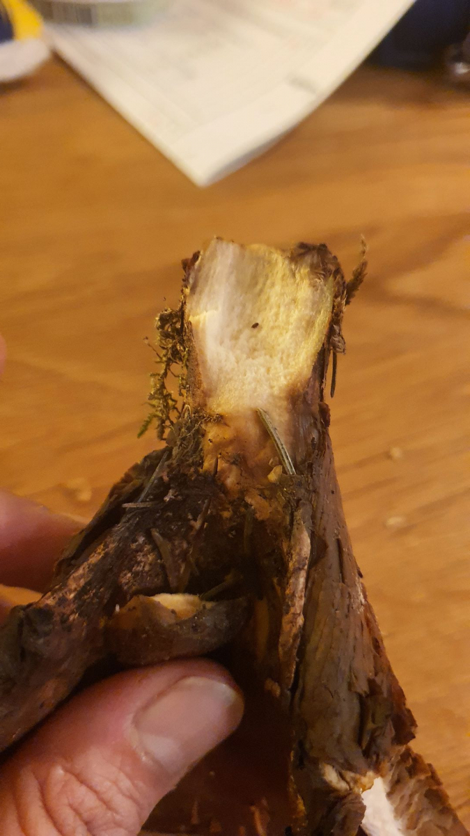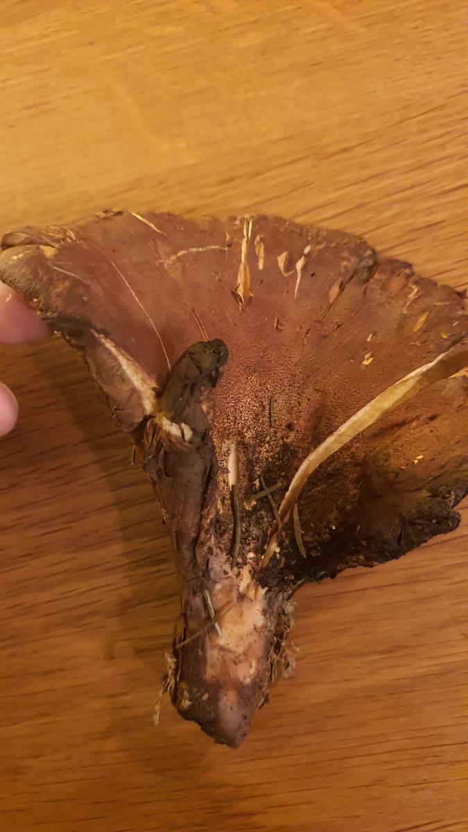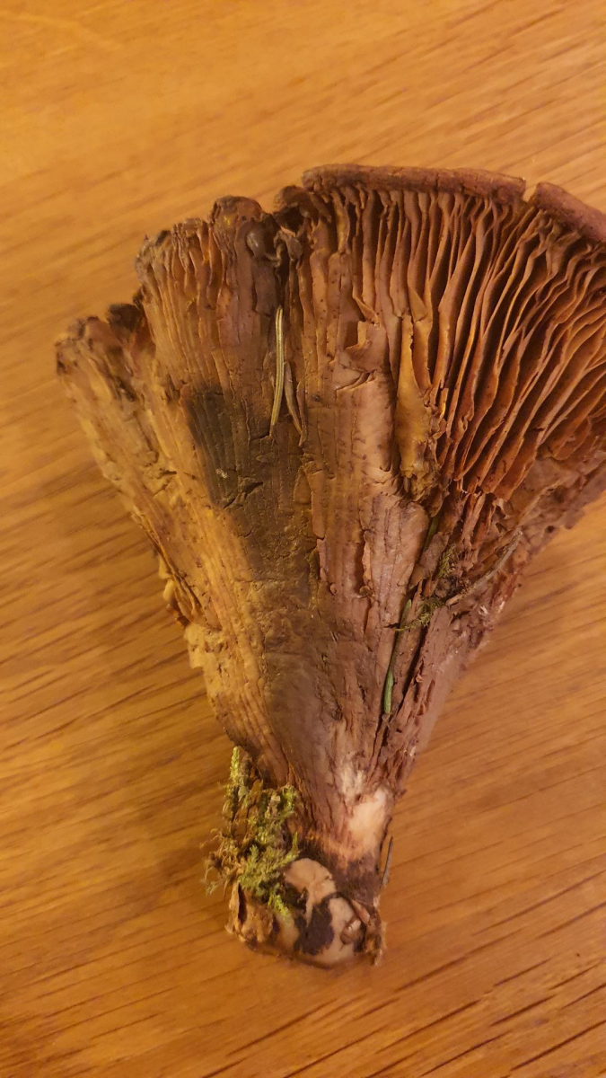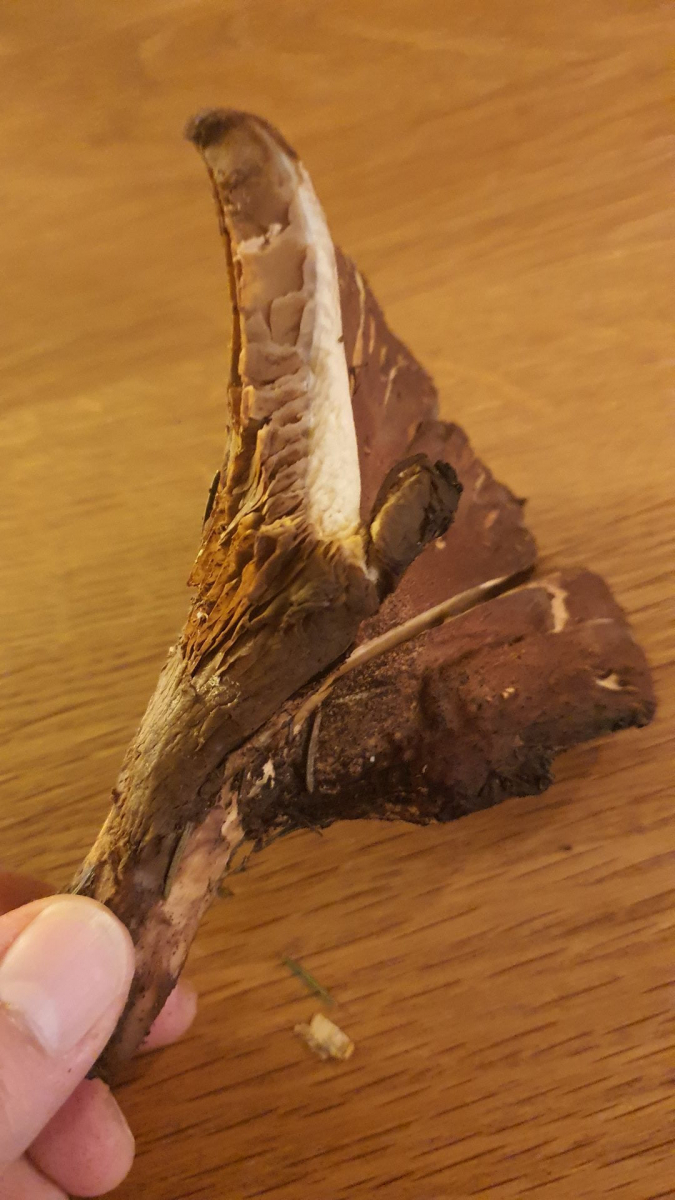 Form eher wie ein halber Trichter. Fleisch weiß, am Hut eher dünn (5mm), nach außen hin noch dünner werdend. Huthaut stumpf und samtig. Pilzoberfläche färbt auf die Finger braun ab.