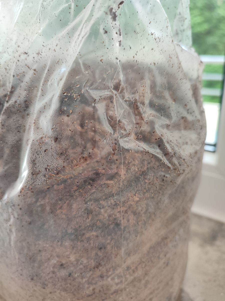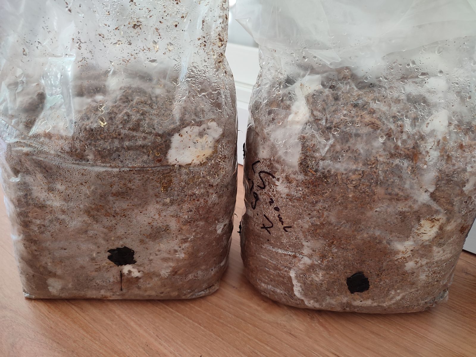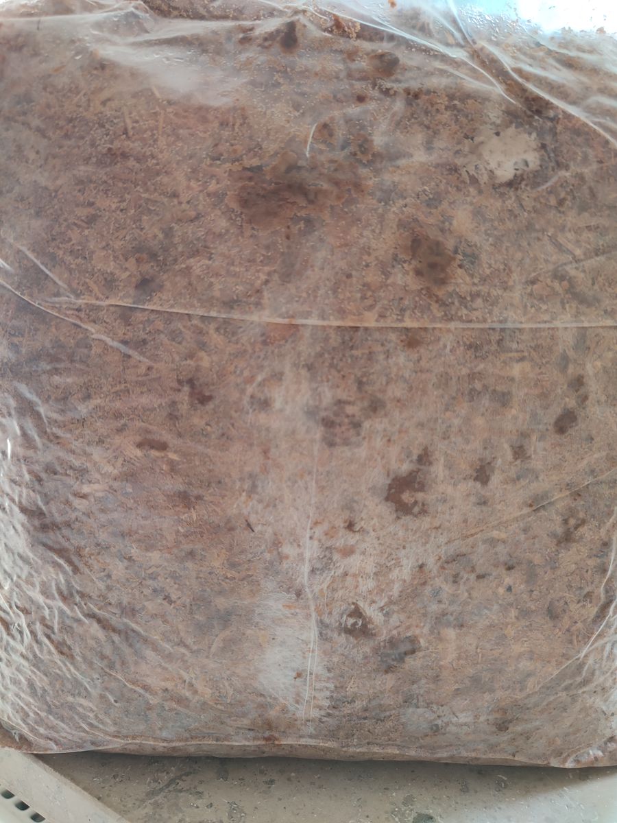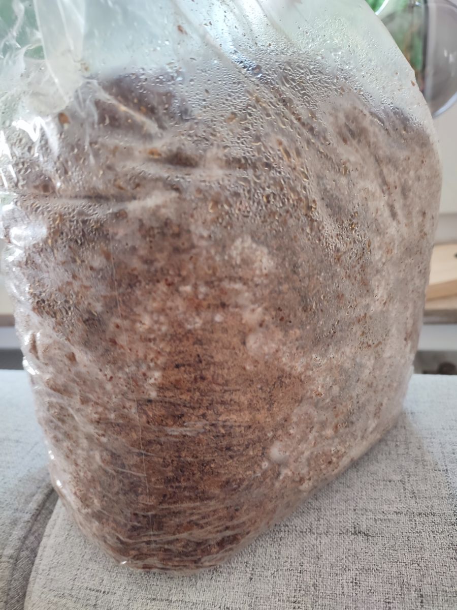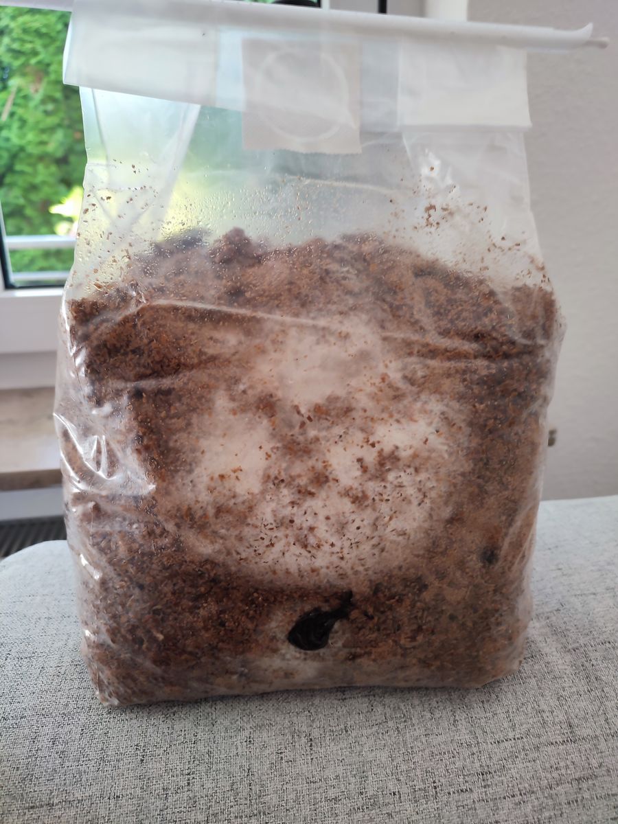 2. Schön sichtbares Durchwachsen vom Austernseitling, Kaffebrut einfach über den sterilisierten Malztreber/Buchenpelltblock geschüttet, bisschen an den Seiten runter rieseln lassen.