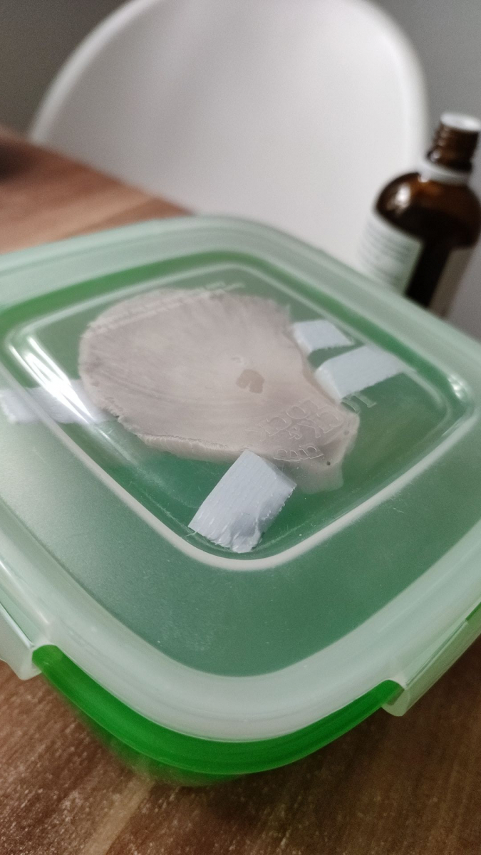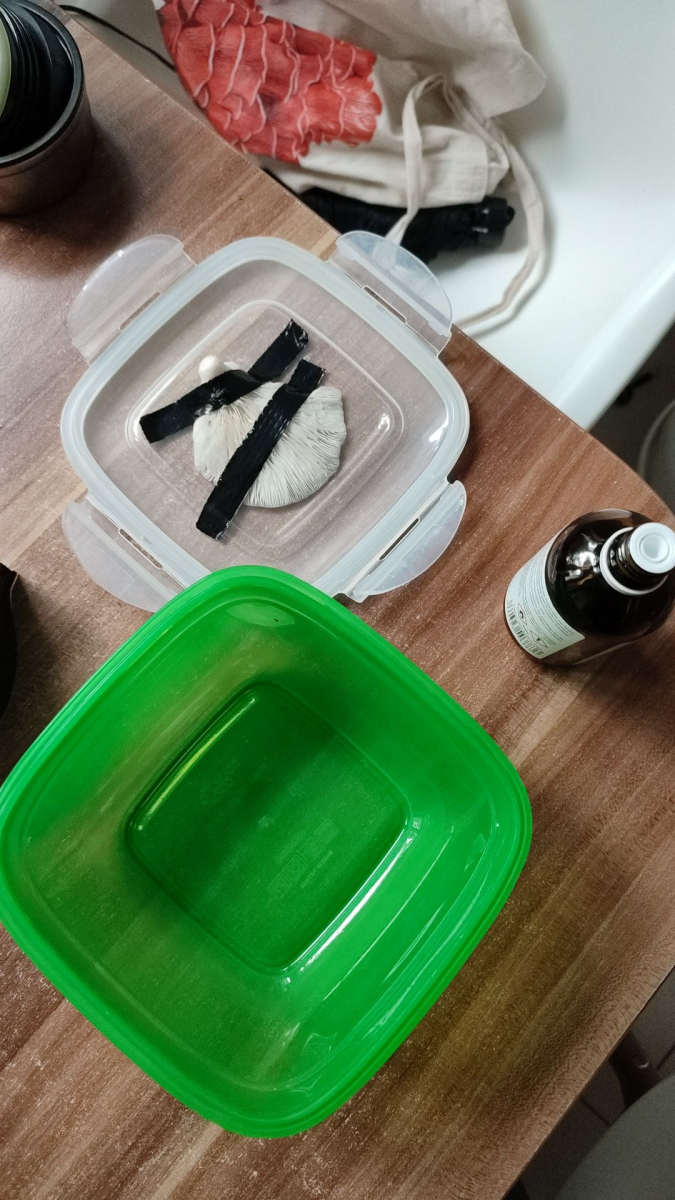 1. Maitake, man sieht unten die Einstichstelle mit Flümy, oben drüber hat sich abgesondert eine weitere Besiedelung gebildet. ich weiß nicht ob das Mycel intern nach oben gewachsen ist, oder ob das eine Konti ist. Konti wäre sehr schade, da dies der einzige Maitakeblock ist.