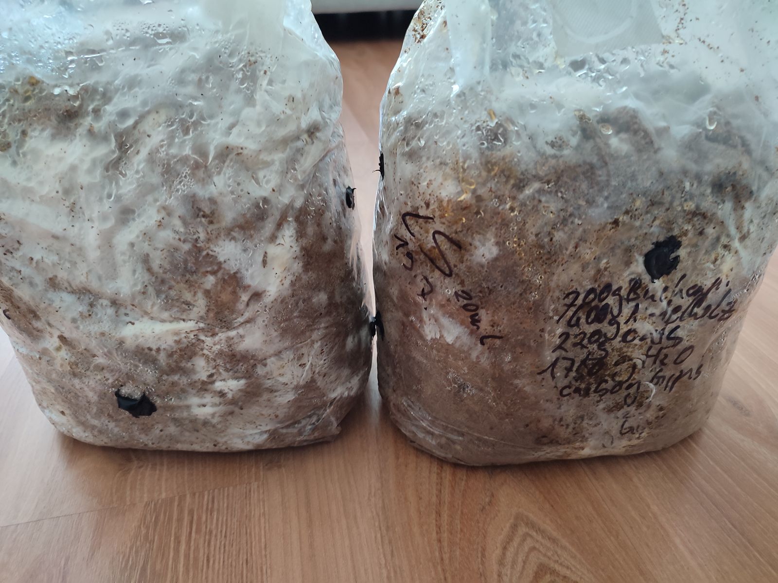 4. Lungenseitling aus Kaffekörnerbrut, so wie oben. Eine Seite Buche/Haferflocken/Gips und eine Seite noch zusätzlich mit 5% Biertrockenhefe. Beide in der Thermobox bei ca. 25 C. Das geht alles schneller da drin!