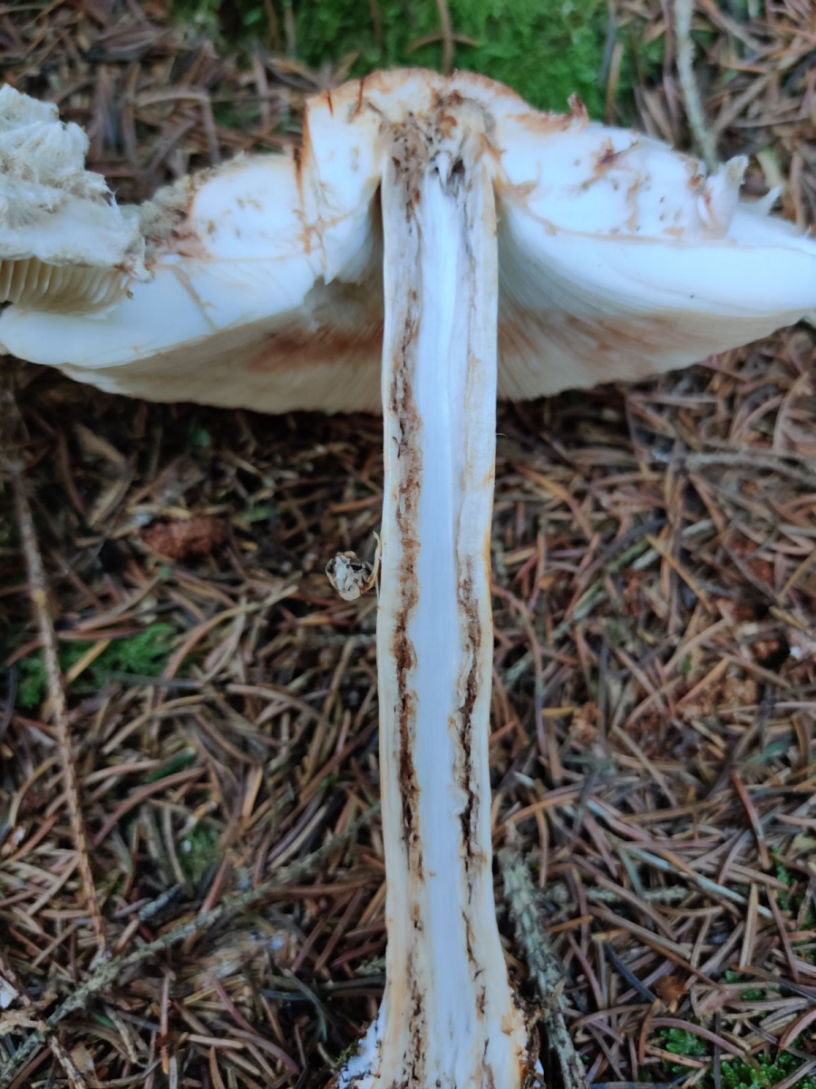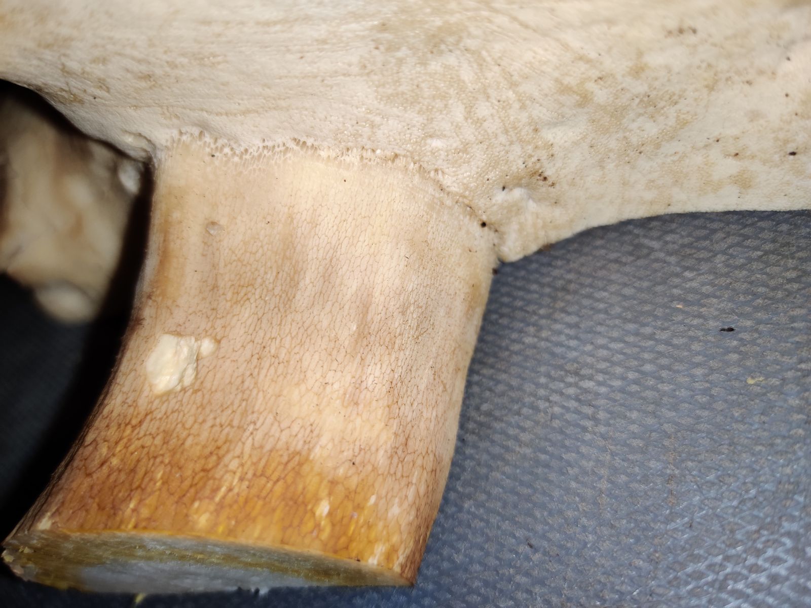 Sehr zahlreich wachsend. Teils Dutzende auf kleinem Raum. Hohler Stiel, klar erkennbare Leisten und Hut mit Loch der fast in den Stiel mündet. Erdinger Geruch.