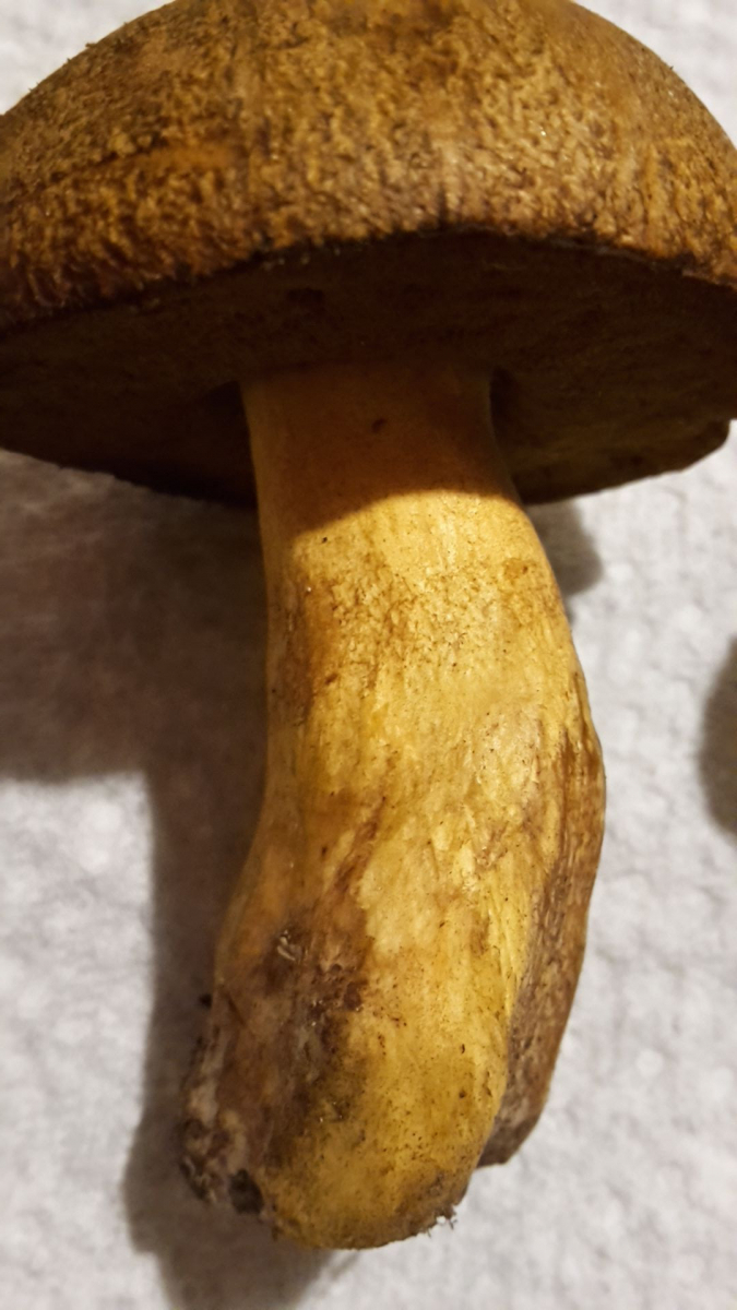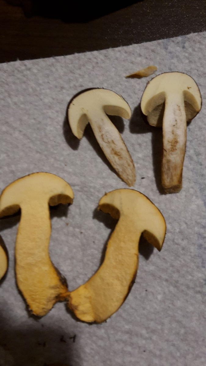So bin ich gestern bei einer Abkürzung durch den Wald unverhofft über eine Horde Pilze gestolpert. Maronen, Butterpilze, etwas abseits auch flockenstieliger Hexenröhrling und dieser Pilz (siehe Bilder). Und da stehe ich wieder und kann ihn nicht einordnen. Für mich sieht das weder nach Steinpilz, Bitterpilz noch Birkenpilz aus. Ich finde leider auch keine treffenden Bilder in Kugel. Hat jemand eine Idee? Der unten jüngere Pilz bläut ganz leicht. Innen ist er gelb, außen auch tendenziell alles gelb, insbesondere das Futter. Anlecken bleibt ohne Geschmack. Zum Vergleich hab ich teilweise Maronen dazu gelegt. Das letzte Bild zeigt den Querschnitt im Vergleich zum Querschnitt einer Marone. Im Futter sind viele Maden, aber im Pilz selber sehe ich Null Madenbefall.