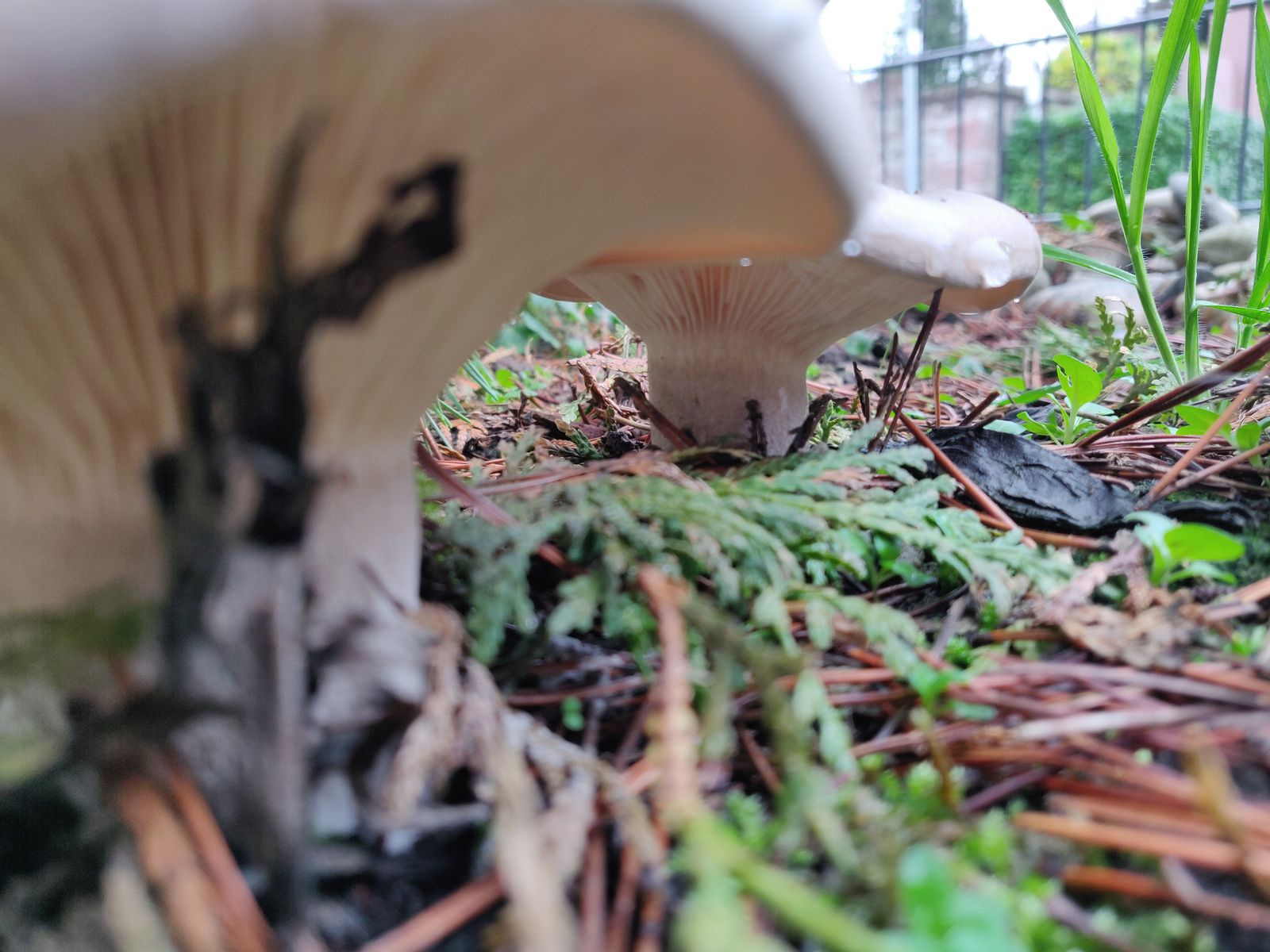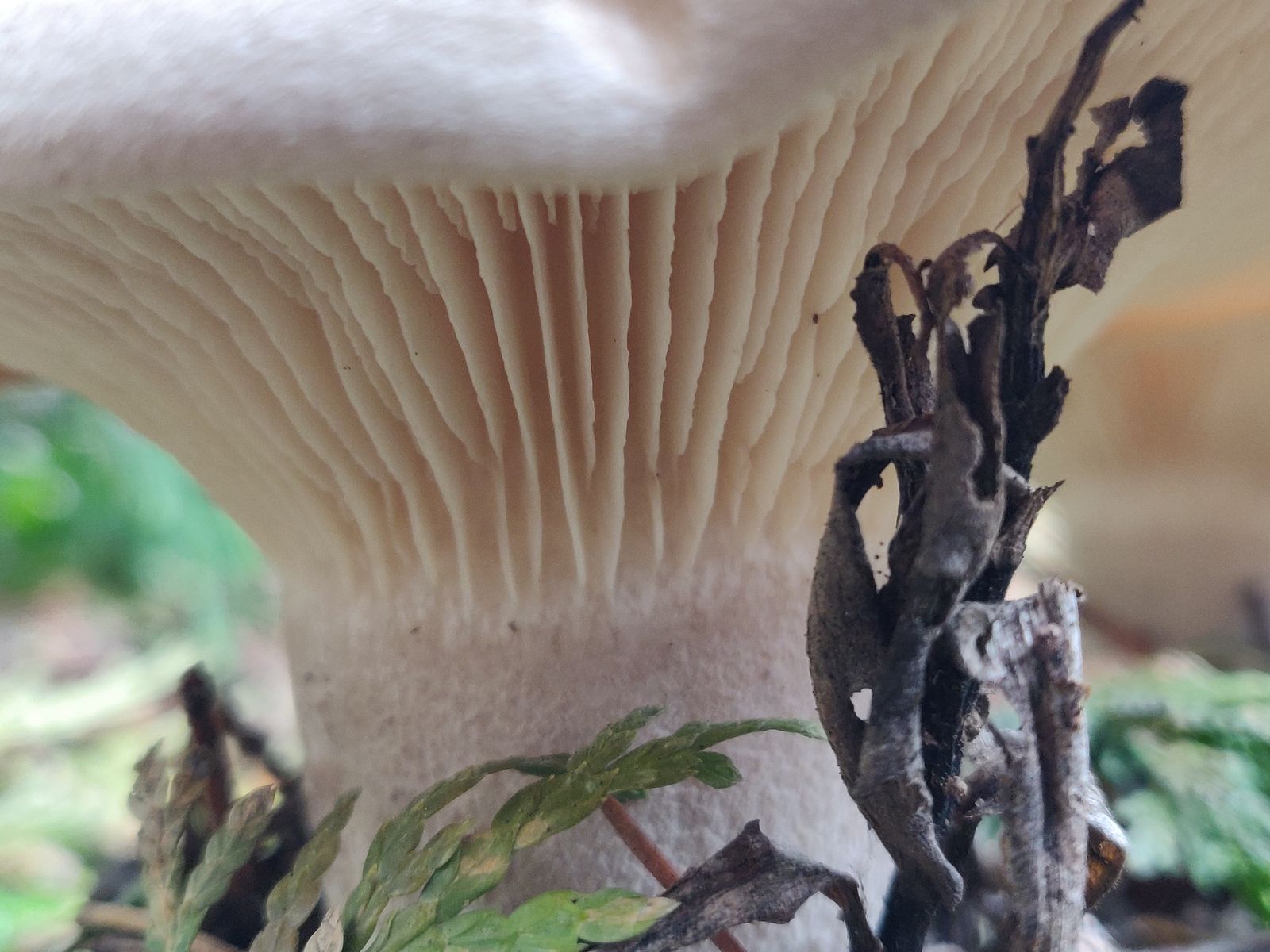 Die Kappe bei dem Pilz in meinem Garten ist viel gewölbter und die Lamellen ziehen sich bis zum Stiel.