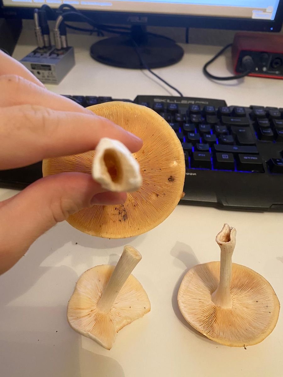 der Pilz fasert, ist hohl hat eine weiße bis leicht orangene Kappe