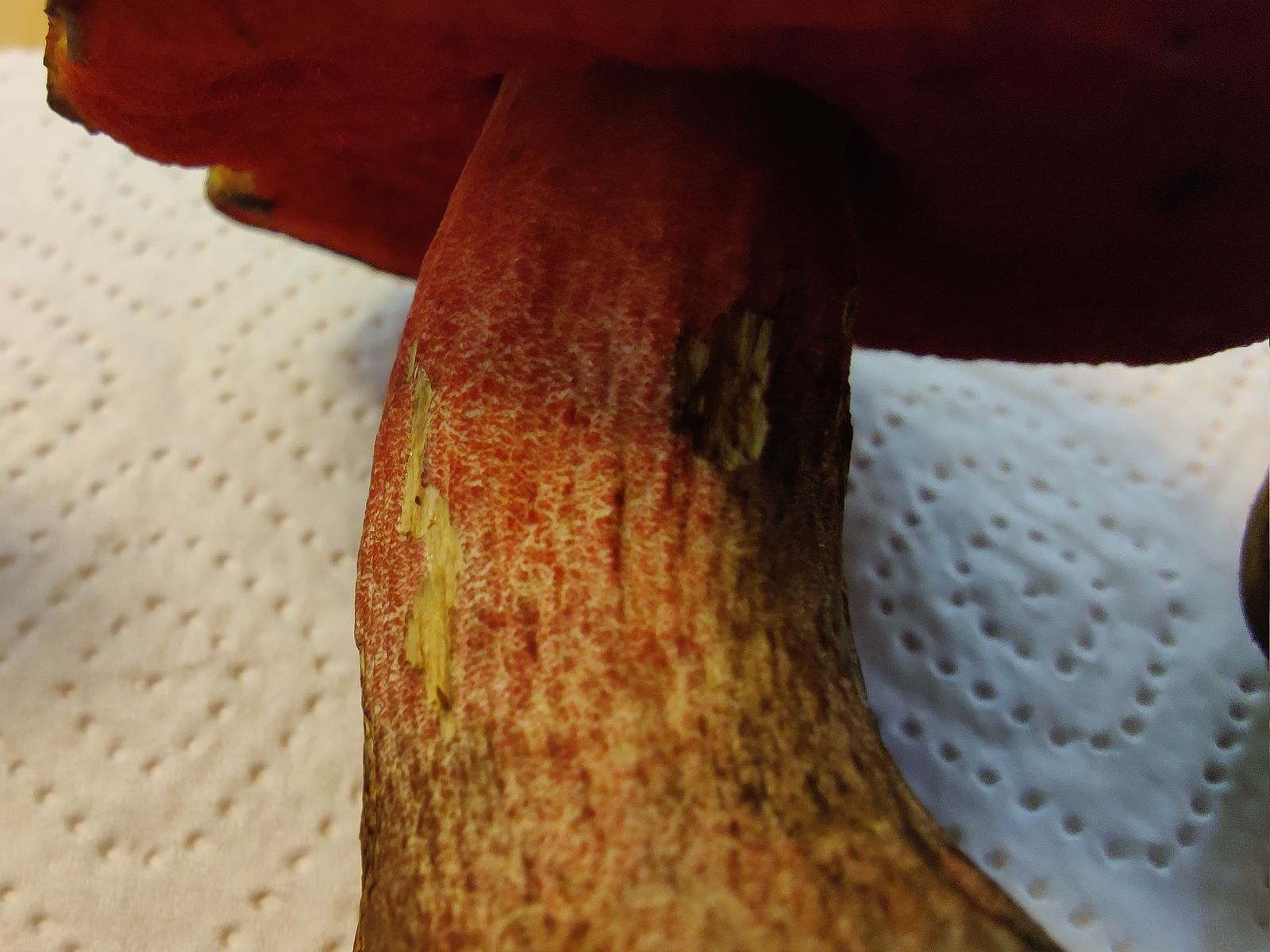 Bei den flockenstieliger Hexenröhrlingen, ist mit flockenstielig diese roten Maserung gemeint?