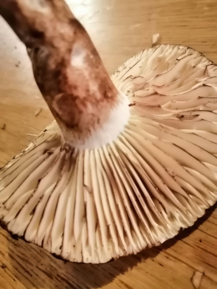 -Lamellen sehr dick, brüchig, am äußeren Hutrand häufig verzweigt, viele nicht bis zum Stiel reichend