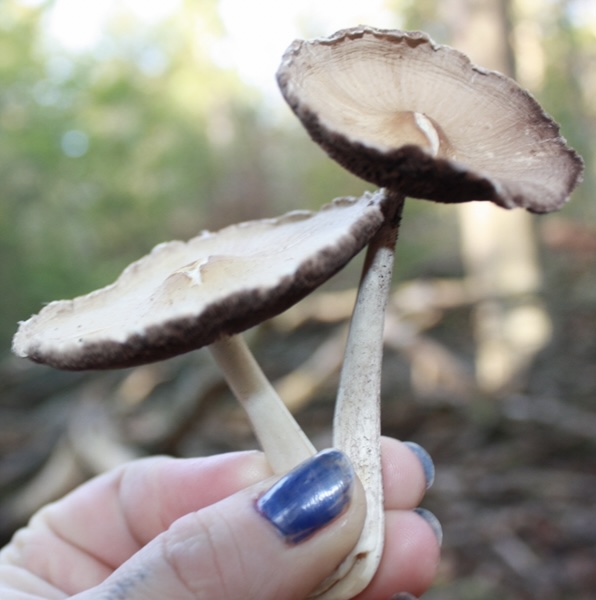Habe den Pilz in einem Mischwald neben und unter Lauch gefunden, er ist etwas 10-15cm groß gewesen, wie auf den Bildern zu erkennen einen Weißen flachen Hut der zur Mitte hin kugelförmig hochgeht, wo er auch rötlich/bräunlich ist. Die Musterung auf der Hut erinnert mich an eine sehr sehr leichte Version von die des Parasols. Der Stil ist weiß mit mal mehr mal weniger vorkommenden rot/bräunlichen Stellen