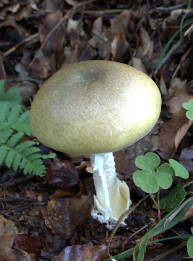 Zunächst war ich wieder an meiner Steinpilzstelle in einem jungen Buchenwald, aber es ist bei uns sehr trocken, und erwartungsgemäß stand dort noch weniger als vor zwei Wochen. Ich habe mich dann von meiner Nase leiten lassen, und erstmals hat die Nase nicht den allerschlechtesten Weg gewählt. Dieser führte zu lichten, moosigen Stellen zunächst mit Lärchenbewuchs. Erstmal fand ich eine stelle mit lecker aussehenden, weissgelblichen Pilzen mit ausgeprägter Knolle. Ich tippte vor Ort auf Knollenblätterpilz, bin mir aber nicht mehr sicher. Der grüne Knollenblätterpilz würde ich erstmal ausschließen. Ich tippe nach einer Recherche jetzt auf Gelber Knollenblätterpilz, das wäre ein Erstfund. Besser schnell weiter!
