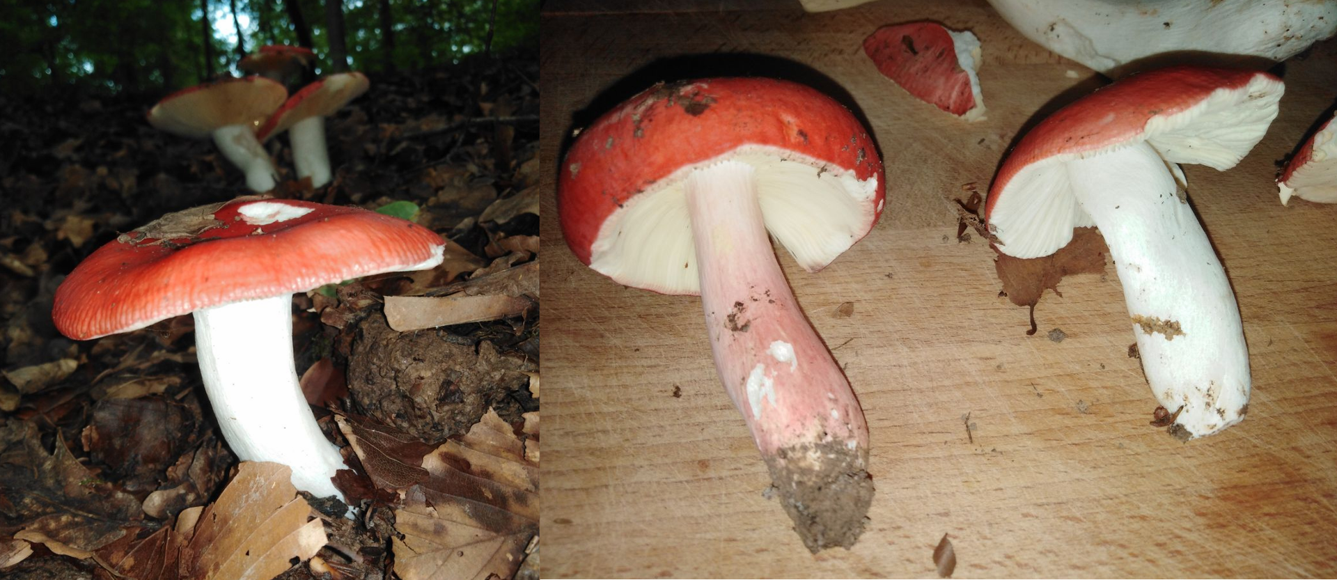 Mein Verdacht: Grüner Knollenblätterpilz. Er stand unter einer Eiche, hatte weiße engstehende Lamellen, am Stiel frei, der Ring oberseitig gerieft. Den habe ich schon gesucht, aber noch nie bewusst in Echt gesehen, also ein Erstfund. Und ohne Pilzliteratur zumindest den richtigen Verdacht gehabt.Ein stückchen weiter an der nächsten offenen Stelle lachten mich erneut vergammelte Rotfüße an, dort schlug ich mich querwaldein den Hang hoch und es dauerte nicht lange bis ich die ersten Täublinge gefunden habe. Ich habe hauptsächlich Täublinge mit roten Hüten gefunden, allerdings habe ich den Eindruck es waren zwei, drei oder vier verschiedene Sorten. Eine Sorte hatte eher dunkelrote Hüte, die Huthaut ließ sich sehr leicht und in großen Stücken abziehen. Geschmackstest zeigte schnell eine scharfe Empfingund an der Zungenspitze, also hab ich die dortgelassen. Spei-Täubling wäre dann plausibel.