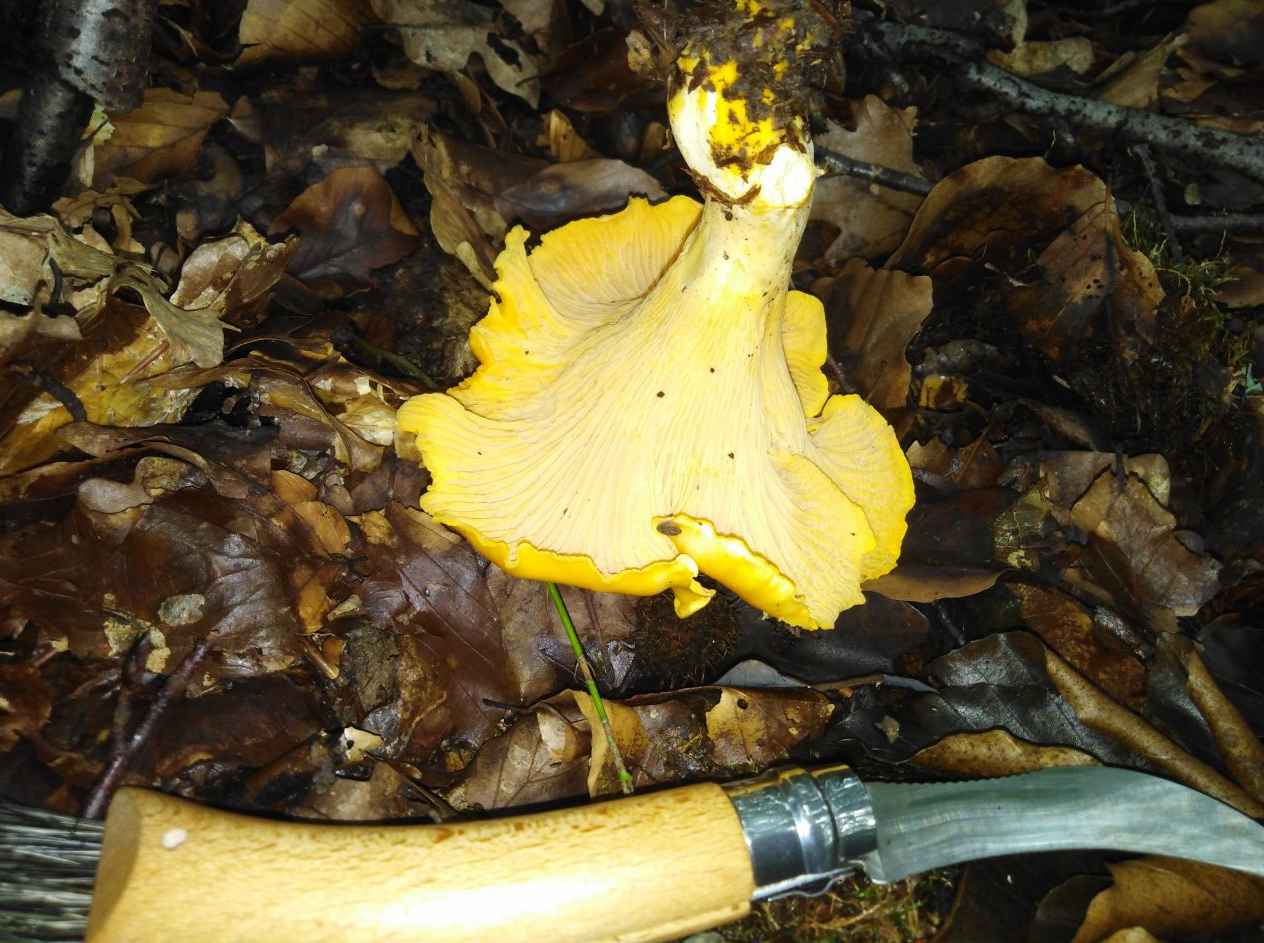 Eine zweite Sorte mit etwas hellerer roter Hutfarbe und weißem Stiel. Zuhause fiel mir auf, dass einer davon einen rötlichen Stiel hat, den würde ich als Harten Zinnobertäubling identifizieren. Der Stiel ist tatsächlich recht hart. Andere haben einen weißen, harten Stiel, so wie der auf dem rechten Foto rechts. Wieder andere haben jedoch einen auffällig weichen Stiel. Vielleicht ist das auch ein Altersmerkmal. Ich sehe jedoch nicht, dass die Huthaut am Rand zurückgezogen ist, also vermutlich kein Speise-Täubling, bei Lüder "Grundkurs Pilzbestimmung" sind Seite 377 diese drei Täublinge aufgeführt, nach dem Ausschließungsprinzip wäre ich dann beim Zinnobertäubling. Ich muss da morgen nochmal einen Geschmackstest durchführen, diese Pilze liegen noch auf dem Brettchen denn es kam noch besser.Zu einem bestimmten Zeitpunkt hatte ich den Korb jedenfalls recht voll mit roten Täublingen, als es plötzlich gelb zwischen den Bäumen hindurch blitzte. Ich habe eine Pfifferling-Stelle gefunden! Und was für Exemplare, da waren mehrere Geräte dabei mit 10 cm Hutdurchmesser. Es waren jetzt nicht dutzende, aber für eine Pilzpfanne hat's gereicht. Die Stelle kommt auf die Liste. In Übereinstimmung mit Frank und Harald war die Stelle ein Nordhang.