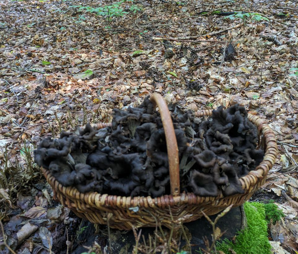 Ein Stückchen weiter fand ich zwei Goldröhrlinge und einen Rotfuß nahm ich auch noch mit. Damit hatte ich drei kleine Pilzchen, die am Grunde des Sammelkorbes (ich hatte den Großen mitgenommen) ziemlich armselig aussahen. So ging es dann weiter in Richtung eines Birken/Fichtenwaldes mit viel moosigen Stellen. Dort traf ich sodann auf eine Sammlerin mit einer ziemlich prall aussehenden Jutetasche. Ich sagte hallo, und dass ihre Tasche ja nach einer erfolgreichen Suche aussähe. Daraufhin durfte ich einen Blick in den Beutel werfen, wahrscheinlich aus Mitleid. Was ich dort sah kannte ich nicht, sie sagte in einem slawischen Akzent etwas von schwarzen Pilzen.