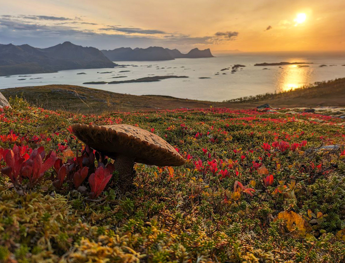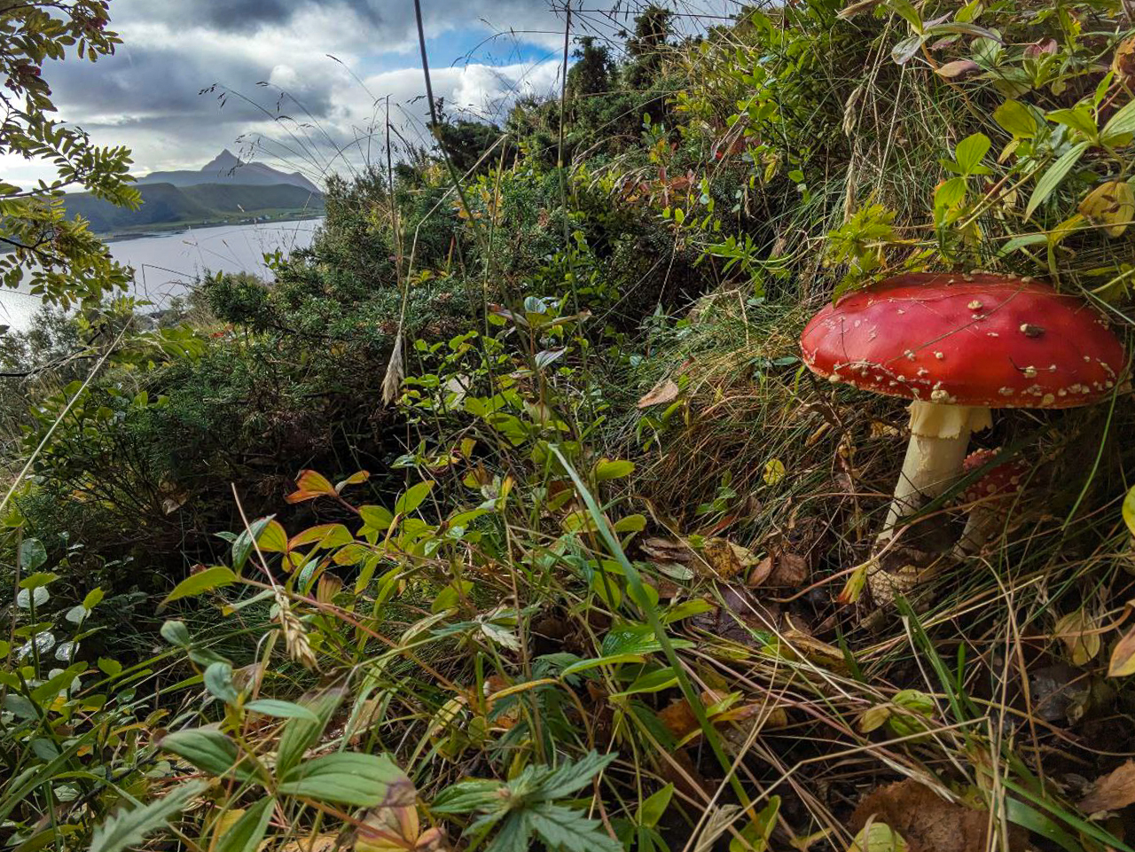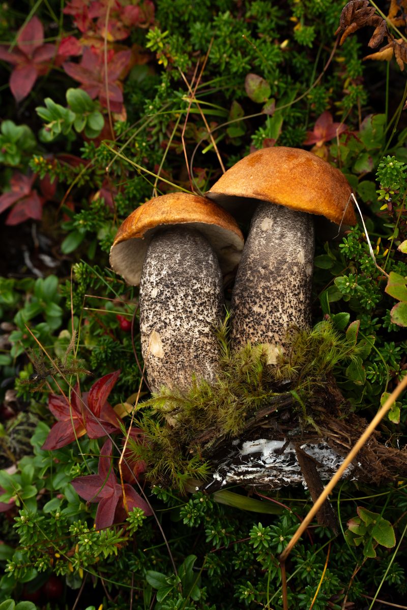 Zunächst einmal war ich auf einem Hügel unterwegs, um nach interessanten Fotolocations zu suchen. Das Wetter war stark bewölkt, und wenn ein Flecken Sonne rauskam habe ich fotografiert. Es war der erste Tag mit kleinen Wolkenlücken. In dieser Fjelllandschaft hatte man insbesondere einen schönen Blick auf die umlegenden Fjorde und Berge, es gab viele Zwergbirken und reichlich Schafscheisse dort. Nicht lange, und ich stolperte über den ersten Pilz. Ich hatte den starken Verdacht, dass es sich dabei um Birkenrotkappen handelt, auch wenn die manchmal einfach nur zwischen Moos, Preisel-, Krähen- und Schweinebeeren standen. Die Abgrenzung zum Birkenrauhfuß war mir jedoch nicht ganz klar.