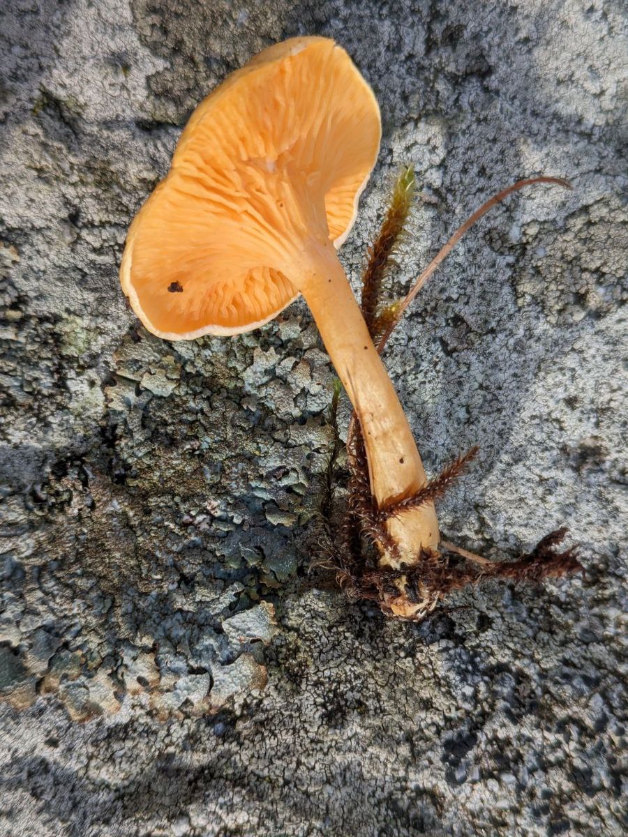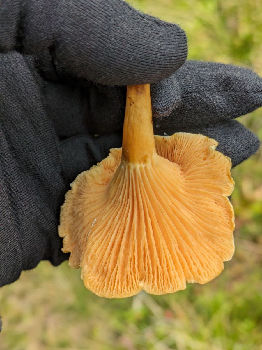und Andere, die ich einmal zu den Leistlingen tun würde (der auf dem Stein - irgendeine Pfifferlingsart?), und einmal als passenden Verwechslungspartner verdächtige (in der Hand). Wegen des Übergangs zum Stiel. Ist das überhaupt ein Leistling?