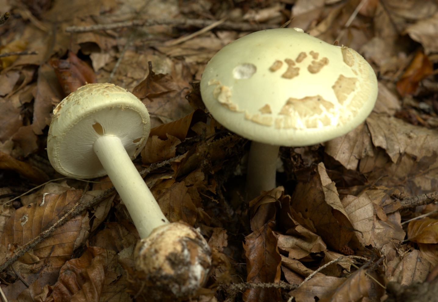 Etwas enttäuscht gob ich nicht auf, sondern ging noch etwas weiter in Richtung eines abschüssigen Buchenmischwalds, an dessen Gipfel ein etwas matschig anmutender Forstwirtschaftsweg entlangging. Das machte einen etwas feuchteren Eindruck als zuvor in den Fichten. Hier lagen mehrere weiße Täublinge herum, die offenbar Jemand nicht mitgenommen hatte. Geschmacksprobe scharf. Und siehe da, davon gab es mehr, und die verdächtigen Laubhäufchen waren garnicht so selten. Zwei Exemplate habe ich für essbar befunden und mitgenommen. Die Stelle scheint jedoch stark besucht zu sein, nach der Menge an Müll zu urteilen. Ein Stückchen weiter fand ich noch einen Goldröhrling, einen Perlpilz, und - siehe da - die Rotfüße. Gerade die Rotfüße sahen schon recht alt aus, und ich glaube da war kein einziger dabei ohne Gelbschimmel. Aber eine neue Sammelstelle gefunden, das nächste Mal wohl erstmal mit großer Mülltüte.