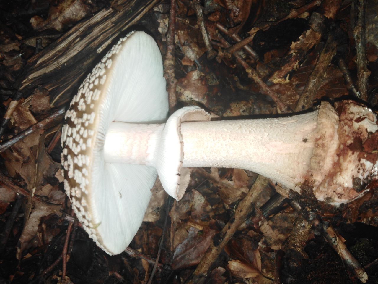 Etwas enttäuscht gob ich nicht auf, sondern ging noch etwas weiter in Richtung eines abschüssigen Buchenmischwalds, an dessen Gipfel ein etwas matschig anmutender Forstwirtschaftsweg entlangging. Das machte einen etwas feuchteren Eindruck als zuvor in den Fichten. Hier lagen mehrere weiße Täublinge herum, die offenbar Jemand nicht mitgenommen hatte. Geschmacksprobe scharf. Und siehe da, davon gab es mehr, und die verdächtigen Laubhäufchen waren garnicht so selten. Zwei Exemplate habe ich für essbar befunden und mitgenommen. Die Stelle scheint jedoch stark besucht zu sein, nach der Menge an Müll zu urteilen. Ein Stückchen weiter fand ich noch einen Goldröhrling, einen Perlpilz, und - siehe da - die Rotfüße. Gerade die Rotfüße sahen schon recht alt aus, und ich glaube da war kein einziger dabei ohne Gelbschimmel. Aber eine neue Sammelstelle gefunden, das nächste Mal wohl erstmal mit großer Mülltüte.