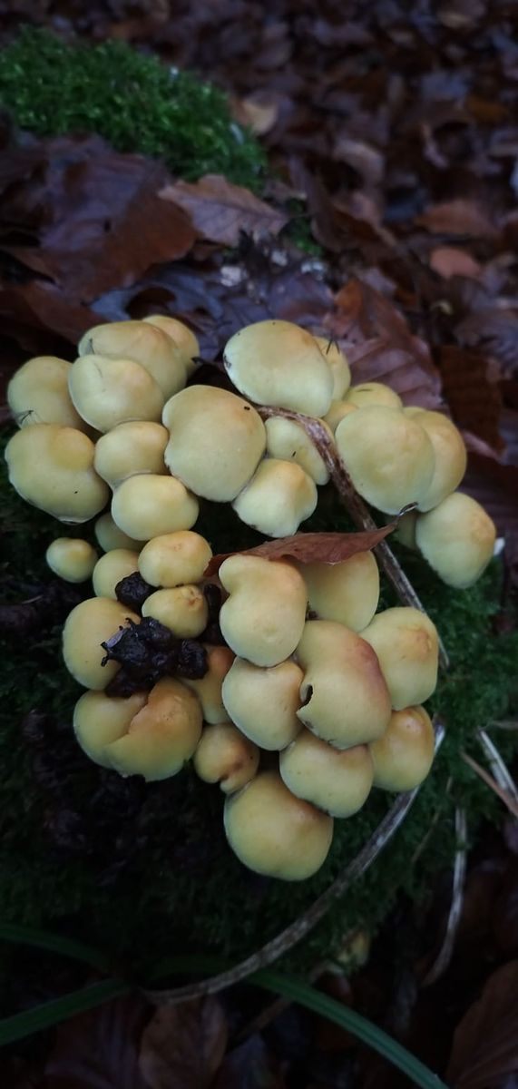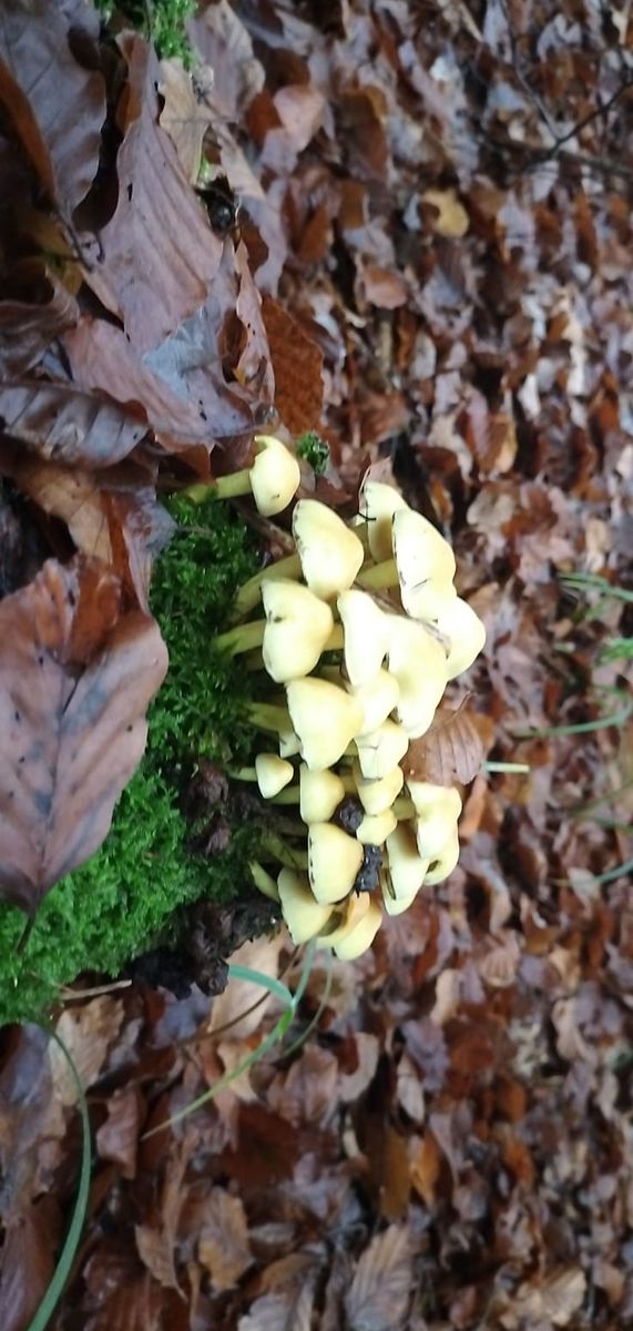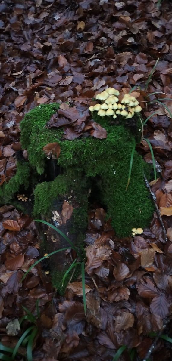 Als ich durch einen Mischwald (überwiegend Laub) gelaufen bin, ist mir ca. 20m unter dem "Weg" direkt ein Stumpf aufgefallen, auf dem auffällig viele Pilze waren. Durch die Farbe war meine erste Intention direkt "Vorsicht giftig".