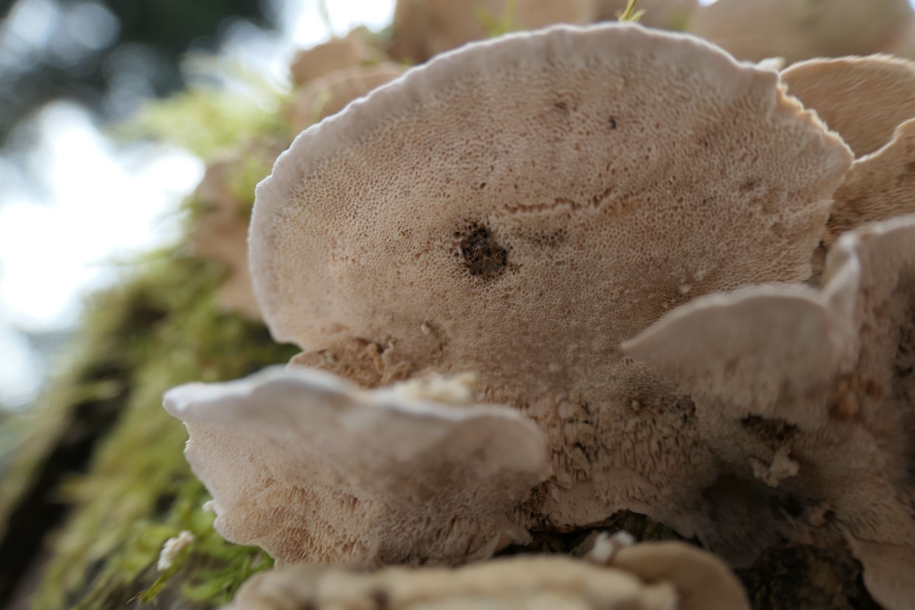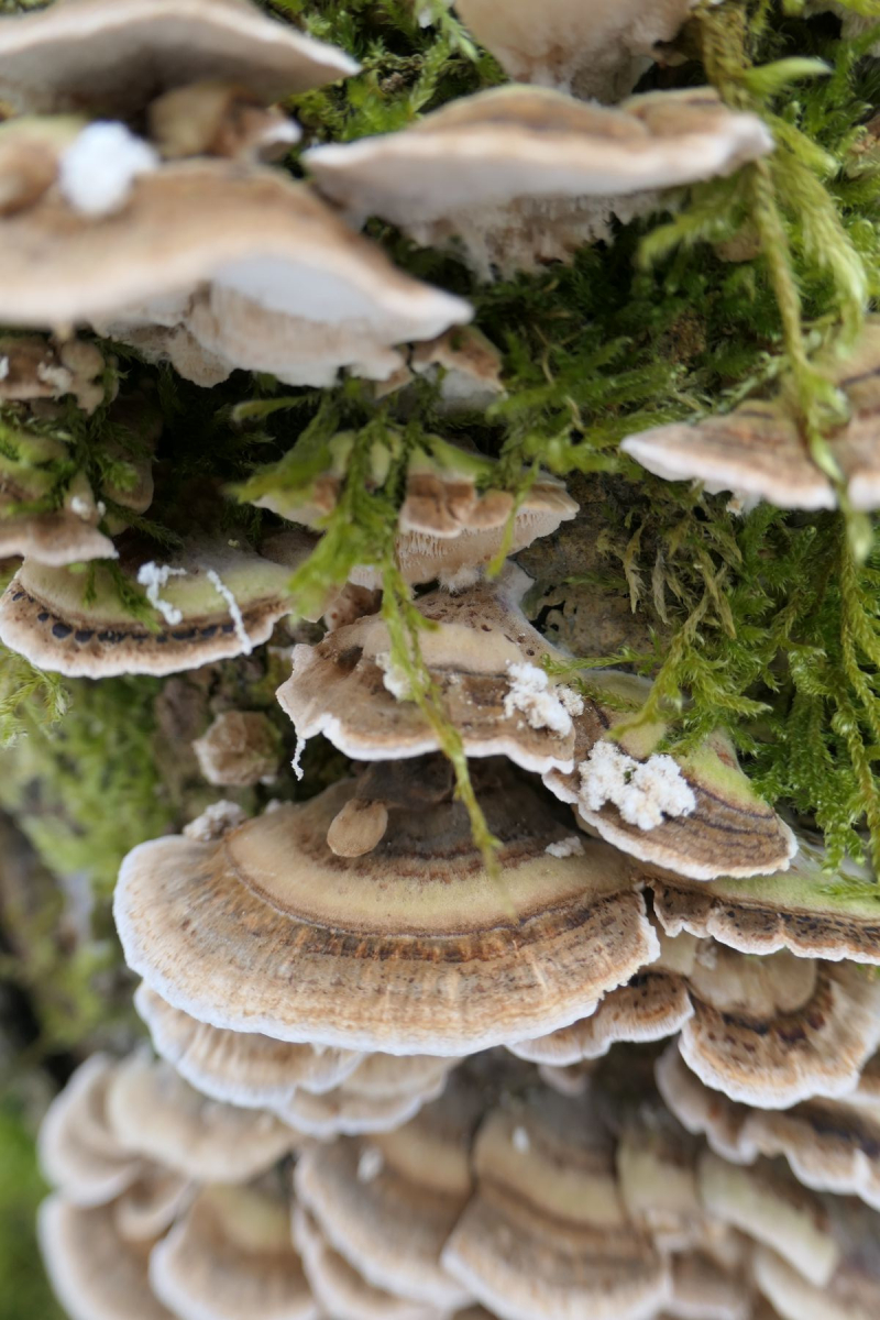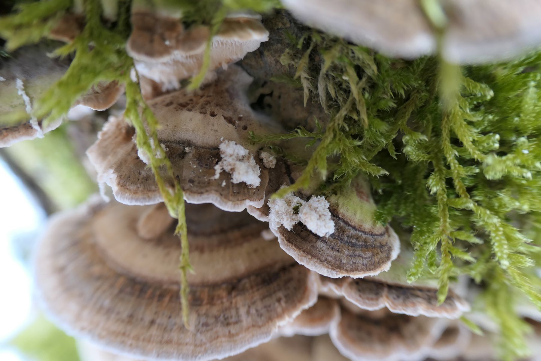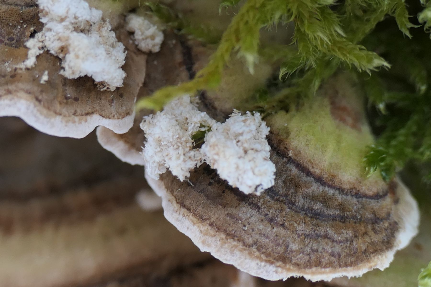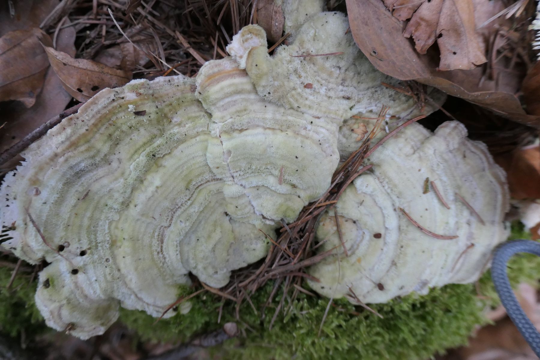 29.01.2023 an einem Nadelholz (wohl Fichte?) Strunk ein durchwegs weisser Baumpilz, oberseitig grün veralgt,