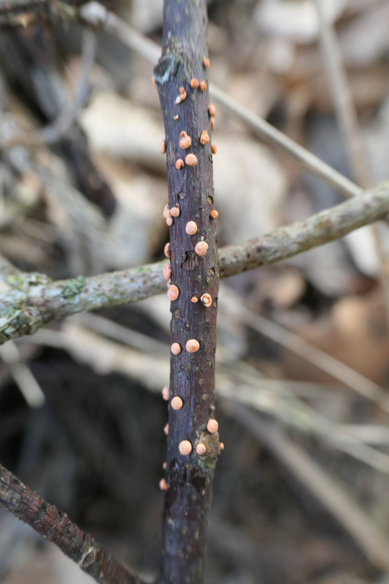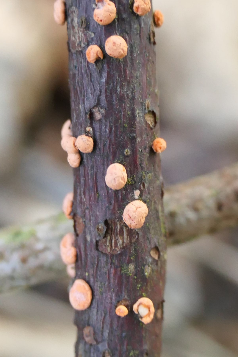 Immer wieder begegne ich an toten Ästchen diesen gehäuft auftretenden rötlichen - auf den Fotos weniger knallig rot wiedergegeben als in natura -, 1-2 mm grossen 'Auflagerungen',