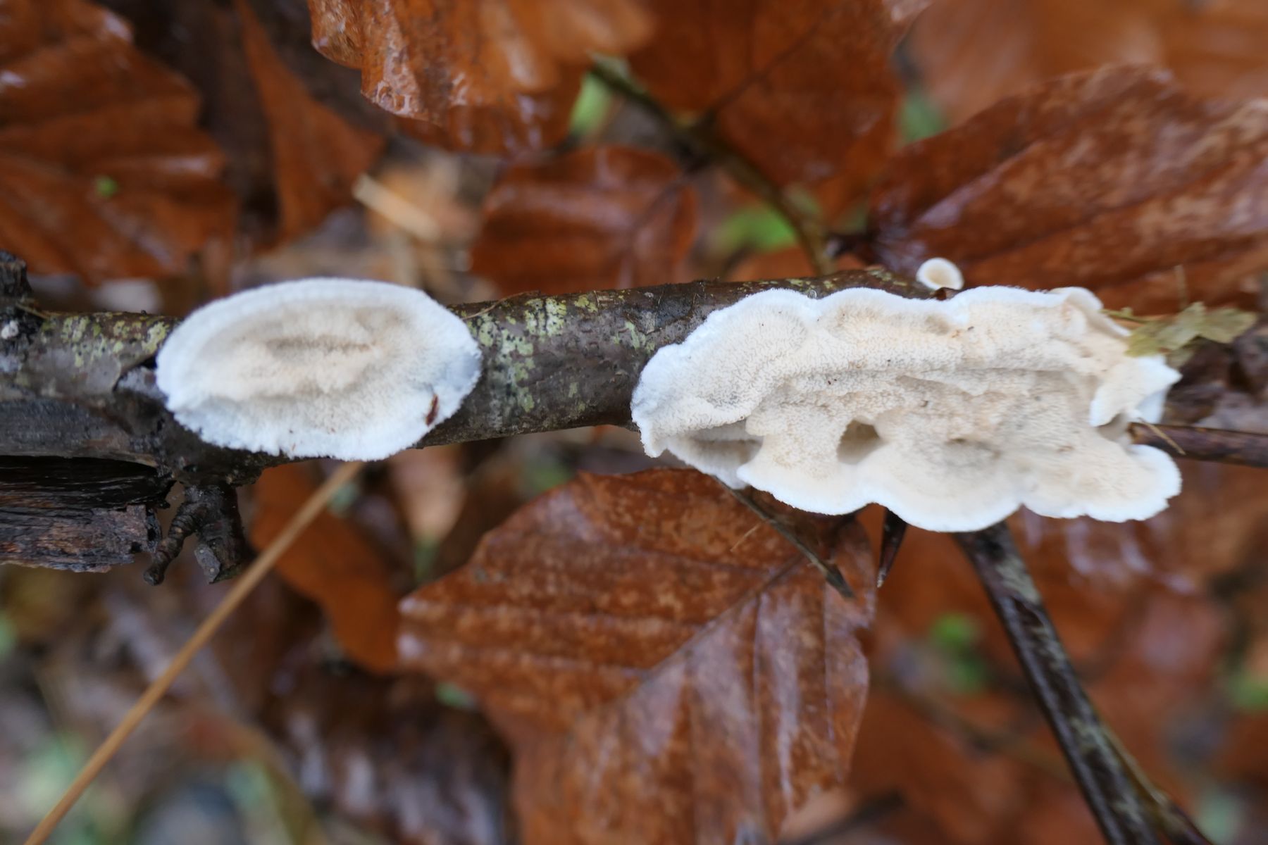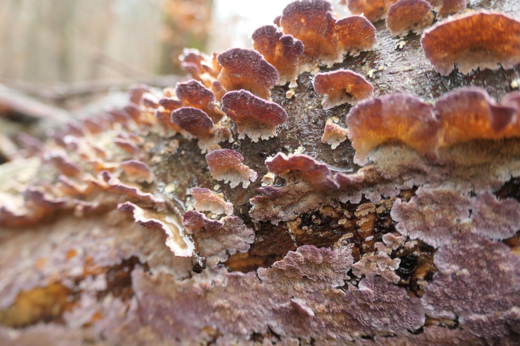 12.01.2023 bei CH-Romont BE Jurasüdfuss, 720 m, an verrottendem Laubholzast 1- max 3 mm grosse orange Auflagerungen - in Natura orangefarbener als auf den Fotos!