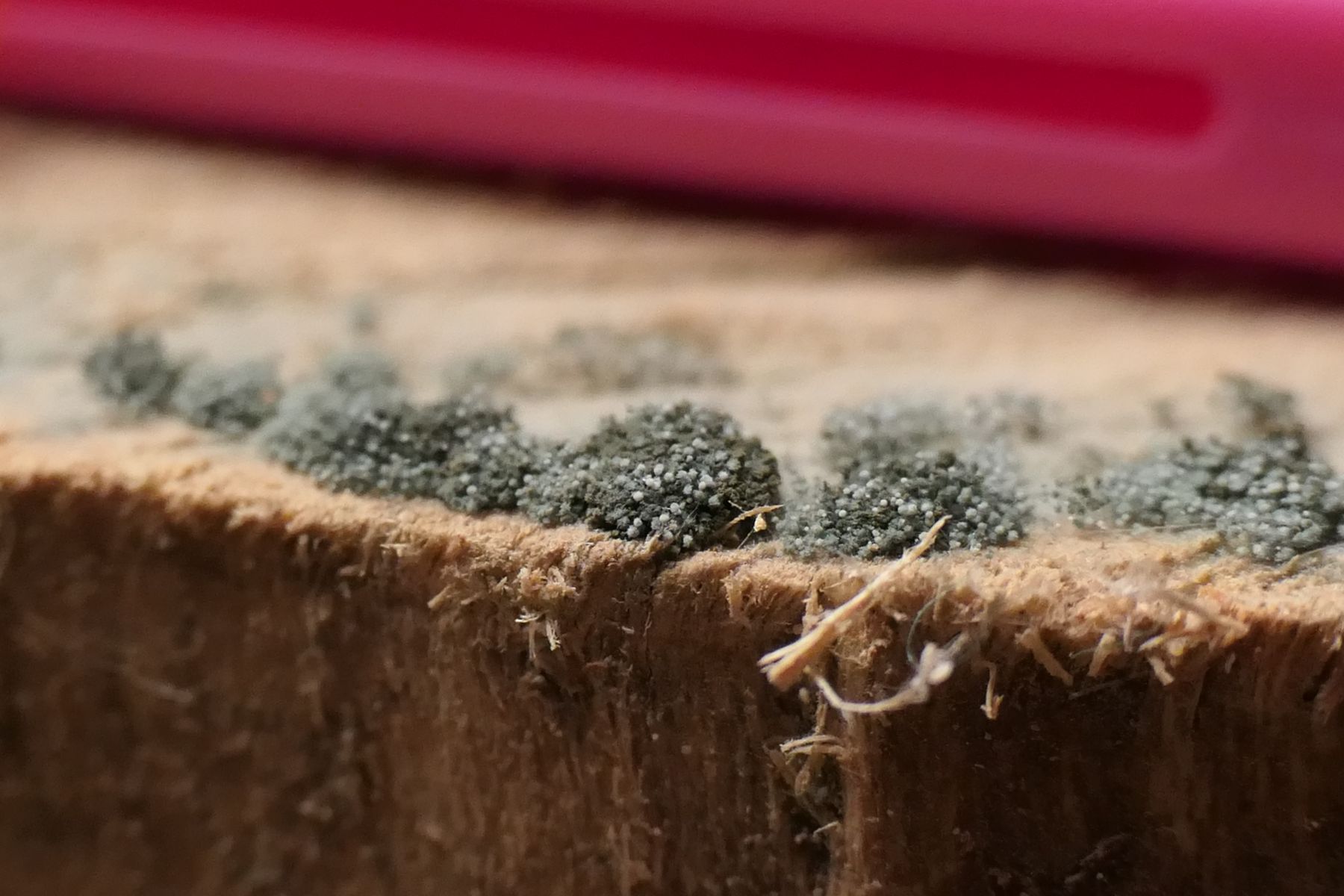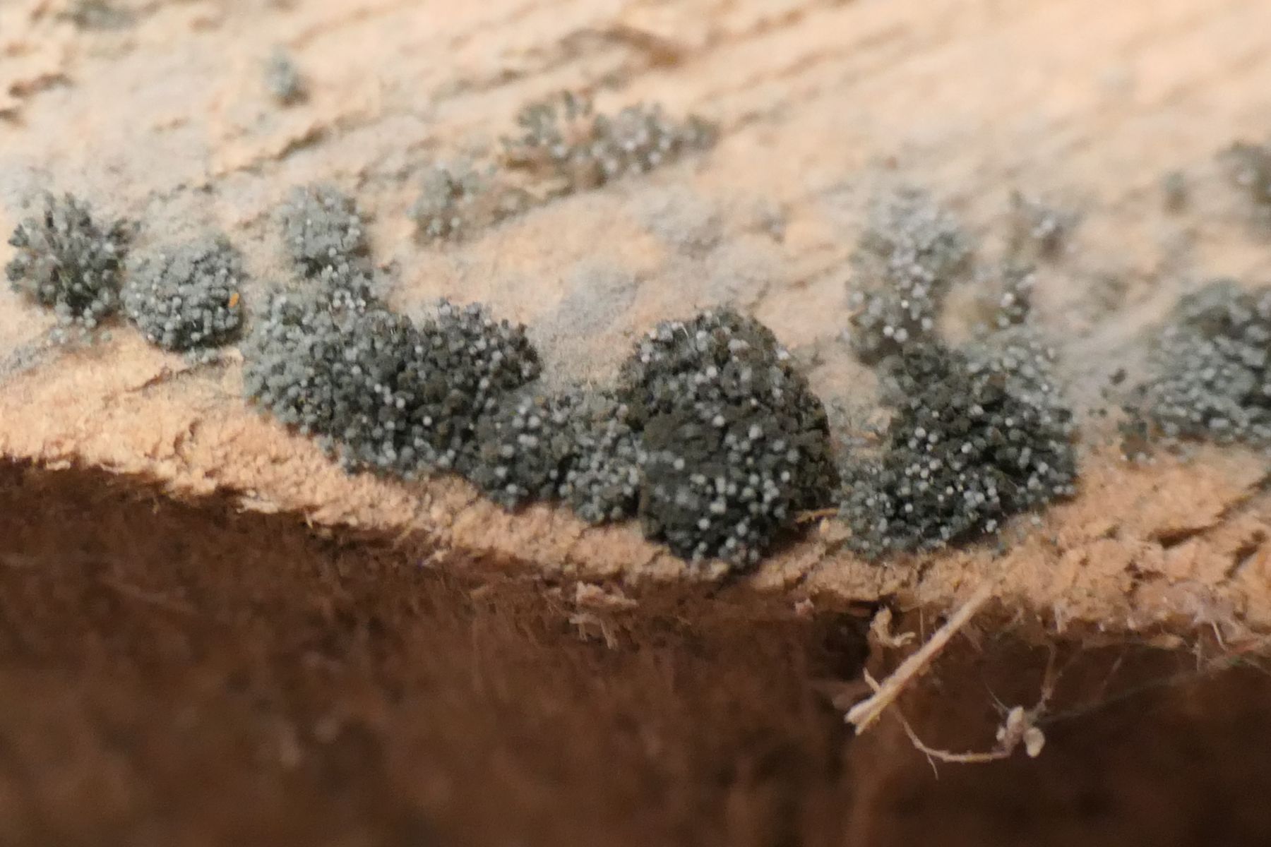 Beim heutigen Einlegen in den Kaminofen habe ich auf den Waldföhren Holzscheitern (2020 gesammelt) an den abgesägten Stellen diese grünlichen Pilzbeläge entdeckt;