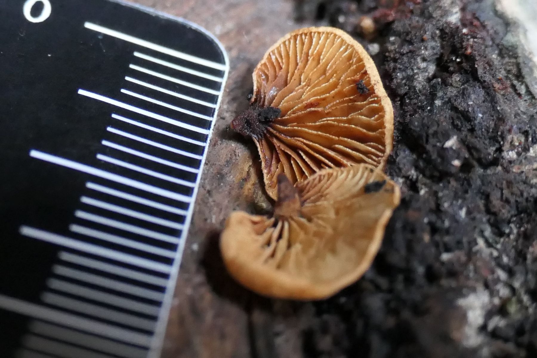 ziemlich elastischer Fruchtkörper, dessen Stiel sich mit einem vom Pilz angefaulten Holzstückchen vom Stamm entfernen liess;