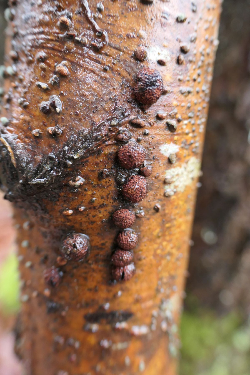 daneben an der gleichen jungen Fichte zwei schwärzliche, haarige Gebilde, die sich sehr leicht von der Rinde abstreifen liessen,