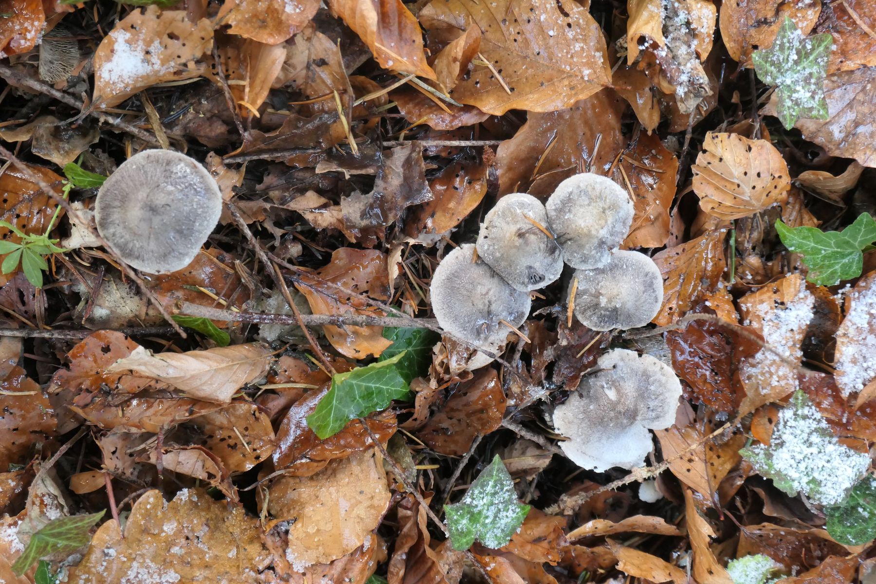 Heute nach erstem Schneefall diese Gruppe von bräunlichen Pilzen