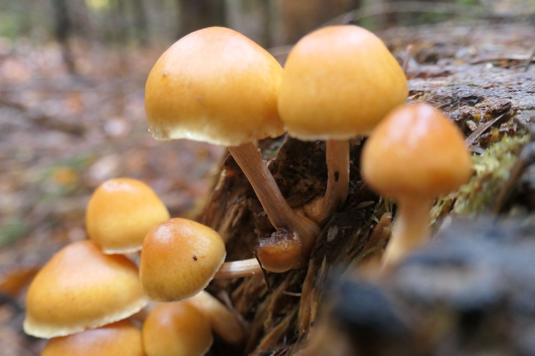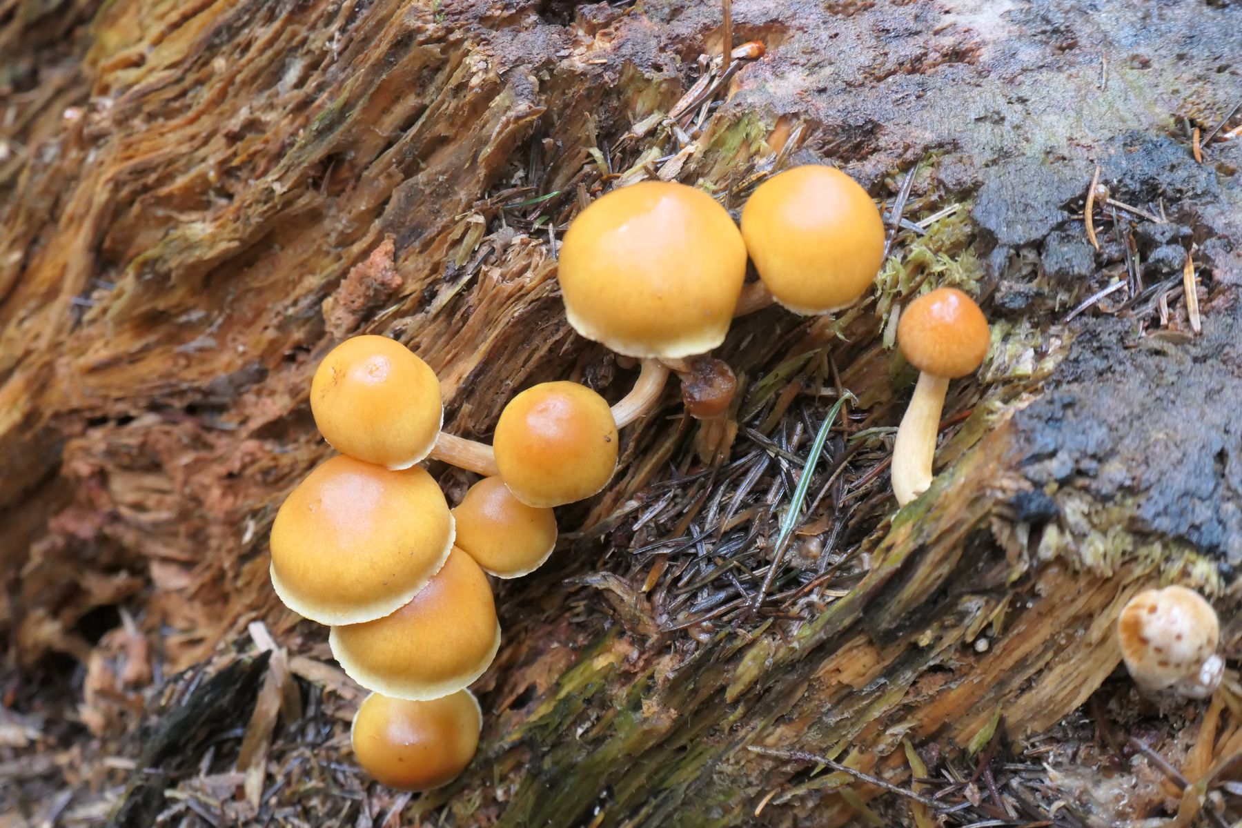 mehrere Individuen an stark verrottendem Baumstrunk, eher Fichte;