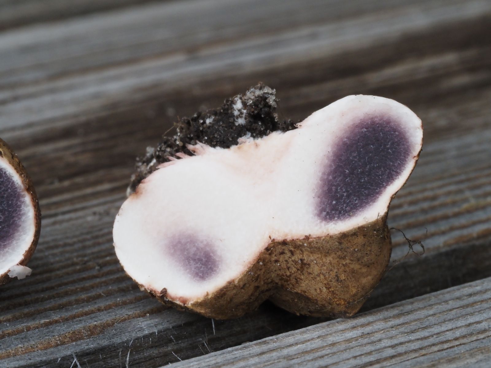 Bild 3: Durchgeschnittener FK mit weißem Fleisch, flächig purpur oder lila gefärbt, dünne Peridie (Hülle)