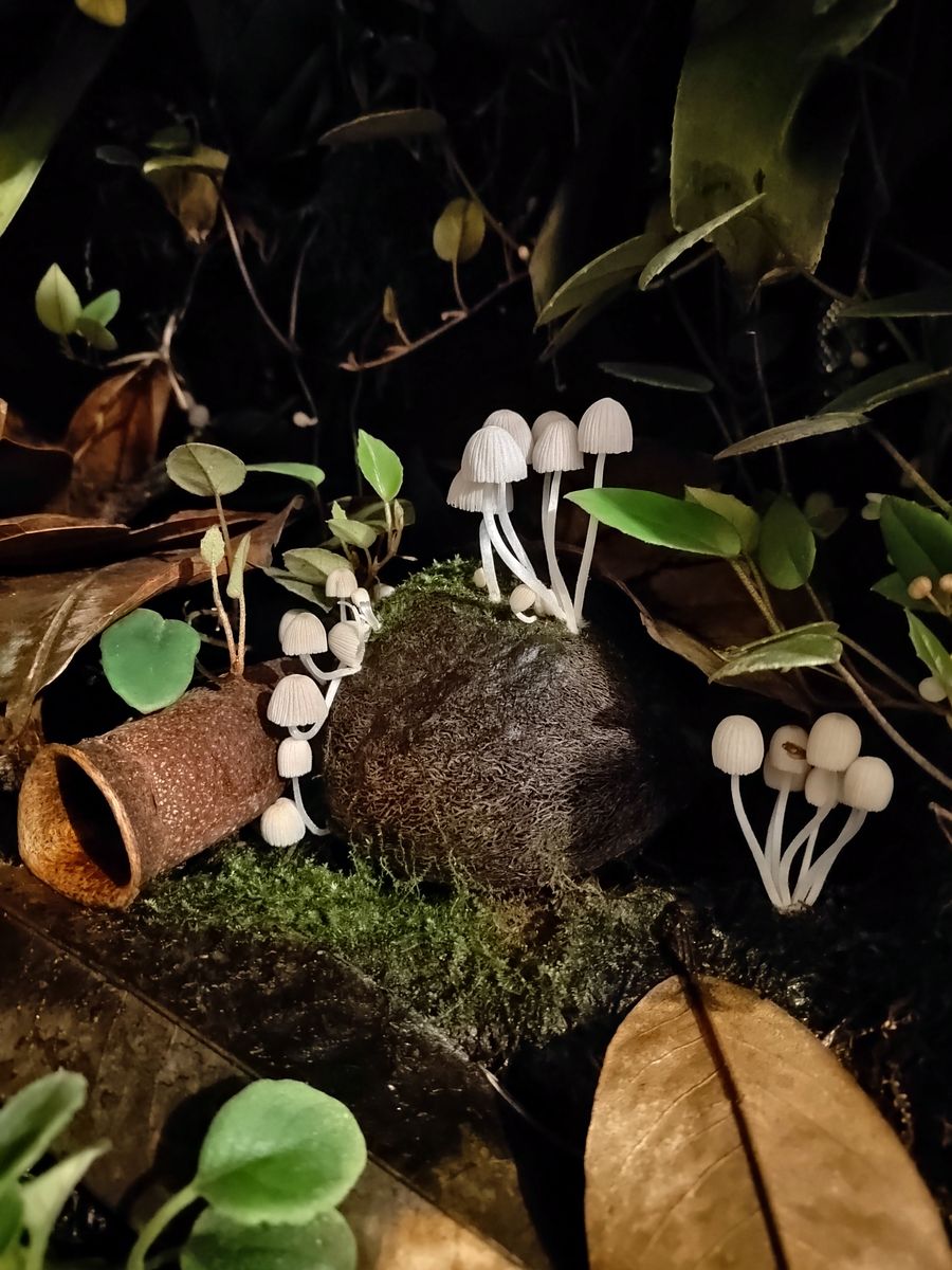 Er erfreut mich in regelmäßigen Abständen mit hübschen Fruchtkörpern, die aus dem Substrat und Einrichtungsgegenständen sprießen.