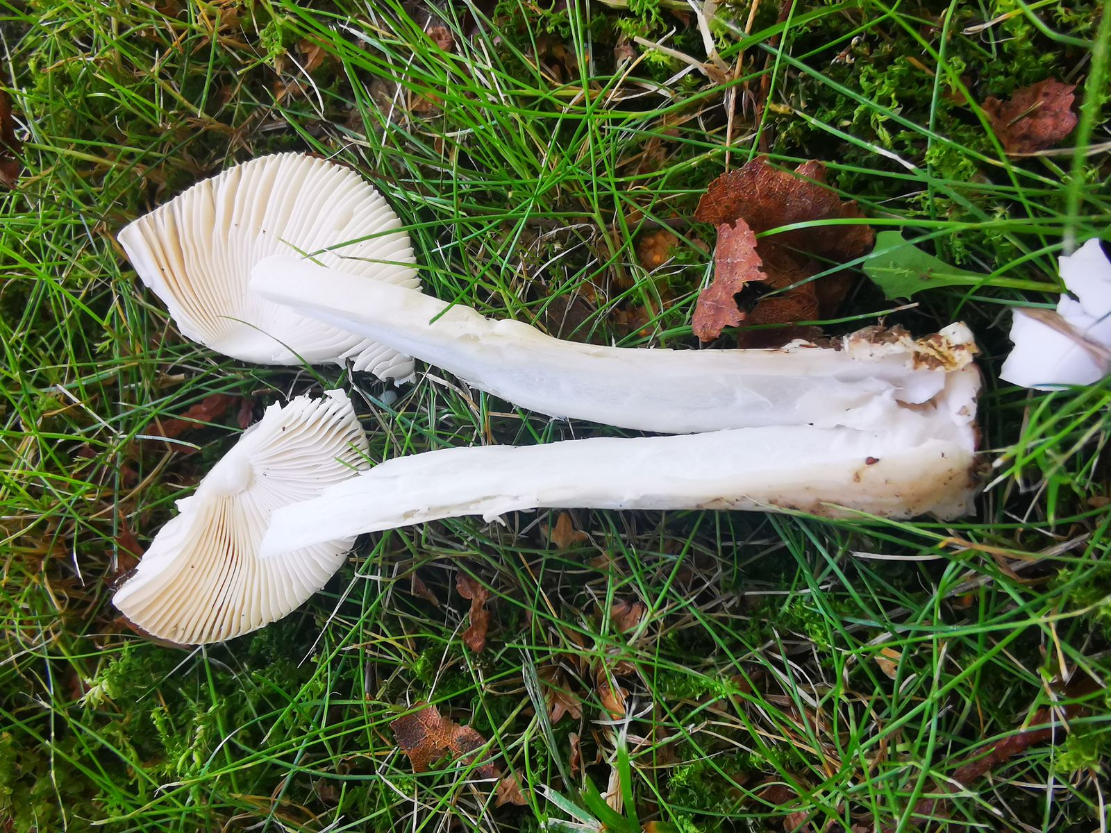 Lamellen sehr dicht stehend, breiter Hut und elfenbeinfarbig.