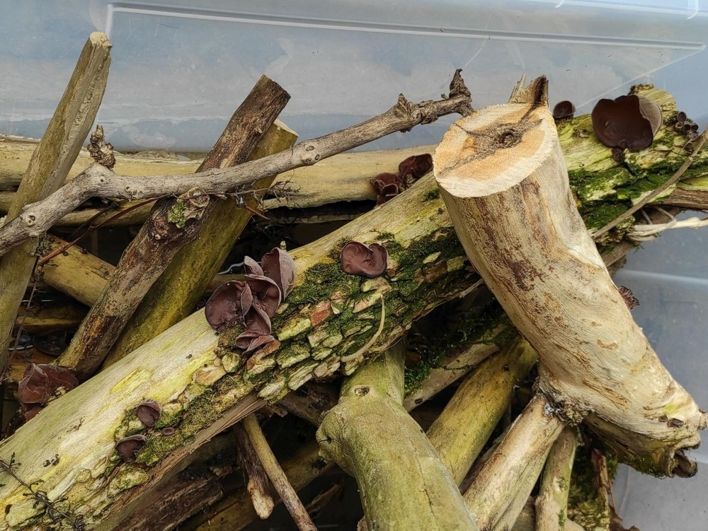 Ich habe einiges Holundertotholz in einer großen Plastikkiste auf der Terrasse. Dort hatte ich wenige Holunderäste mit Judasohren eingelegt und später kamen auch auf anderen zugelegten Holunderstammstücken welche.