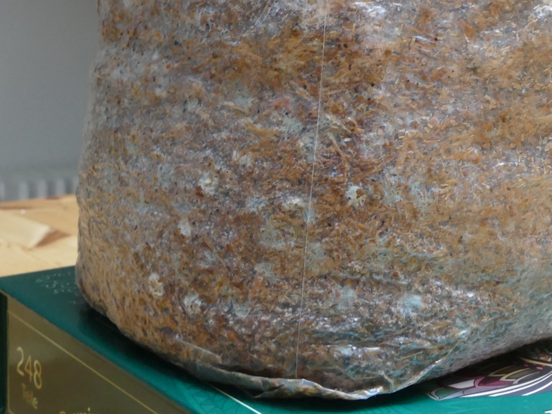 Mache übrigens gerade einen interessanten Test mit einem kontaminiertem Substrat. Da ist oben alles perfekt durchwachsen nur im unteren Bereich haben Getreidekörner kleine Schimmelinseln gebildet. Ursache dürfte die Füllung im Körnerbrutbeutel bis in die mittig liegende Filterfläche gewesen sein. Schimmel dahinter, den ich nicht erkannt habe. Ich setzte die Fläche nun einer UVC-Strahlung aus und schaue, ob das Myzel den Klotz noch sauber durchwächst und der Schimmel gestoppt wird. Das gewünschte Myzel schütze ich mit Alufolie.Die Pilzzucht bleibt ein ständiger Lernbereich.