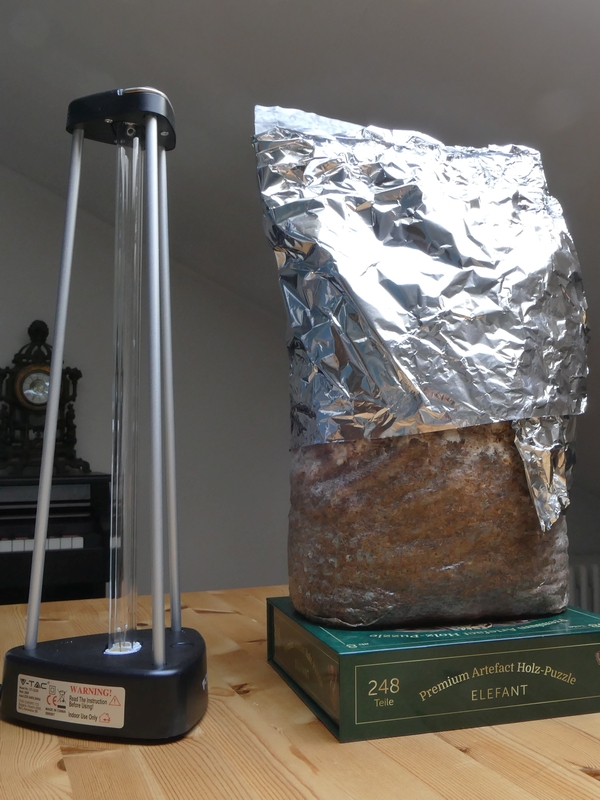 Ich habe die Box mit einem Lüftungssystem ausgestattet, um das hinzubekommen. Dazu gibt es einen Einlassfilter aus der Patientenbeatmung und einen entsprechende Auslassfilter, um auch keine Pilzsporen aus der Box in den Raum zu blasen. Allerdings konnte ich bislang keine Dokumention zur Filterrate finden, weshalb ich das noch nicht genutzt habe. Deshalb verwendete ich das UVC-Licht. Die Körnerbrutbeutel hatte vorher mit Alufolie umantelt, damit die Brut keinen Schaden nimmt.