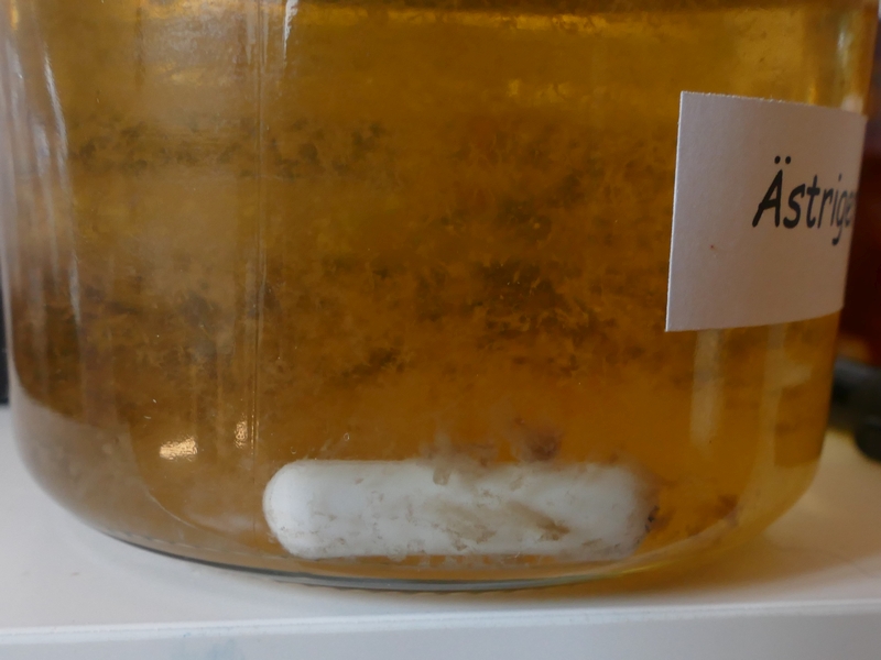 Ich habe das Glas sofort entnommen und abgewaschen. Danach die Box und alle Gläser mit Chlorlösung zu desinfizieren versucht. Ich hoffe nicht, dass mir jetzt durch das Micropore hindurch alle Brut abgetötet wird. Das Glas steht nun isoliert. Die Körnerbrut ist mit dem Rosenseitlingmyzel bis unten durchwachsen. Woraus der Bäckerpilz seine Energie zieht, ist mir völlig schleiherhaft, da er bei dem Glas keinen Zugang zum Getreide hat, es sei denn er hätte es in der kurze Zeit durch das Micropore und das Rosenseitlingsmyzel geschafft. Auf jeden Fall braucht der Bäckerschimmel unbedingt Sauerstoff, denn er wächst immer nur da, wo er Luft bekommt. Das war auch in den Tüten so. Unter diesen Bedingungen mit offensichtlich Sporen überall bekomme ich auf jeden Fall nie eine eigene Kultivierung hin.