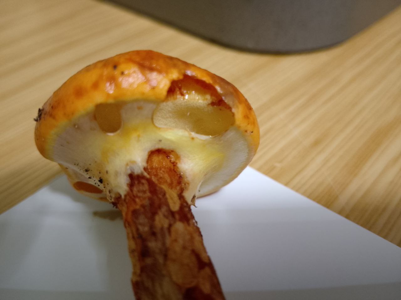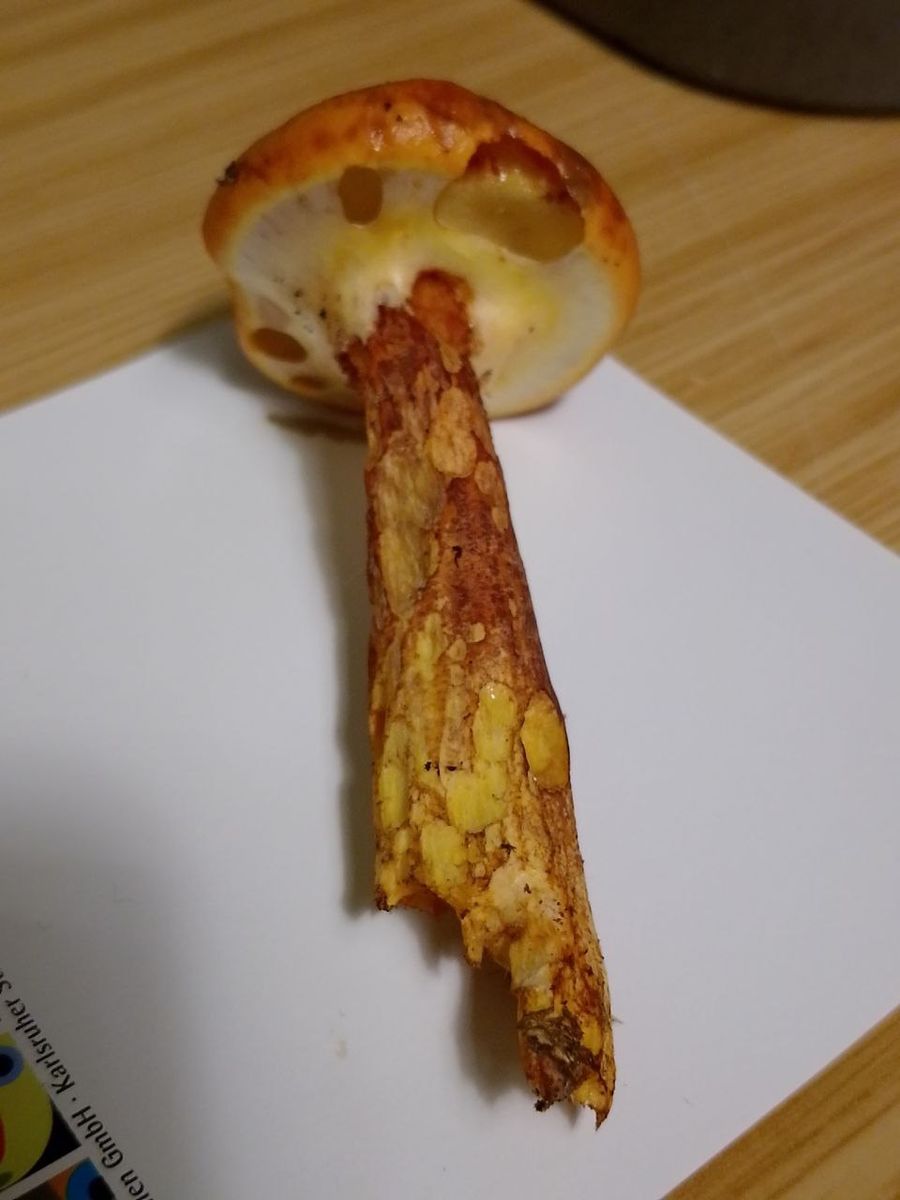 Von der Ferne betrachtet sah dieser Röhrling wunderschön aus, ich dachte wegen der Hülle erst an einen Schleierling. Da sind aber definitiv Röhren drin, der Hut ist gold und schleimig!