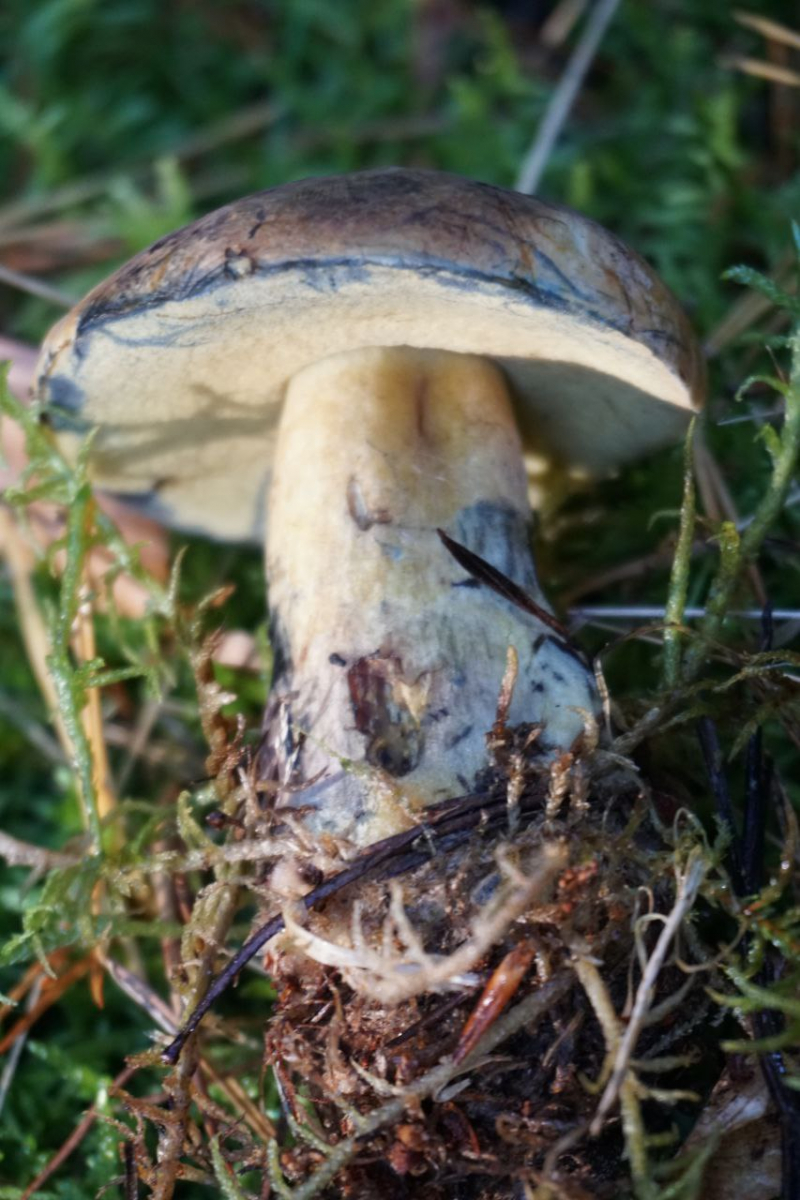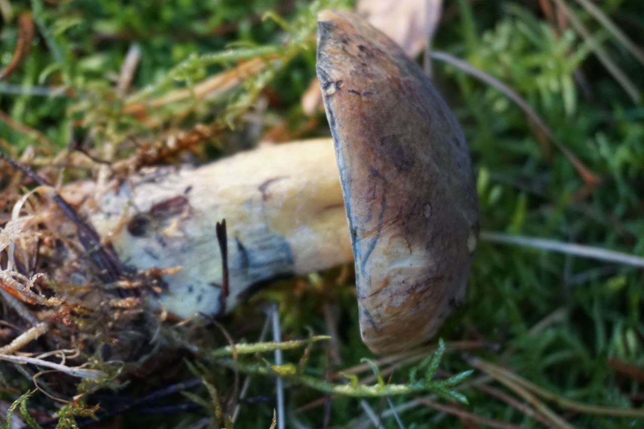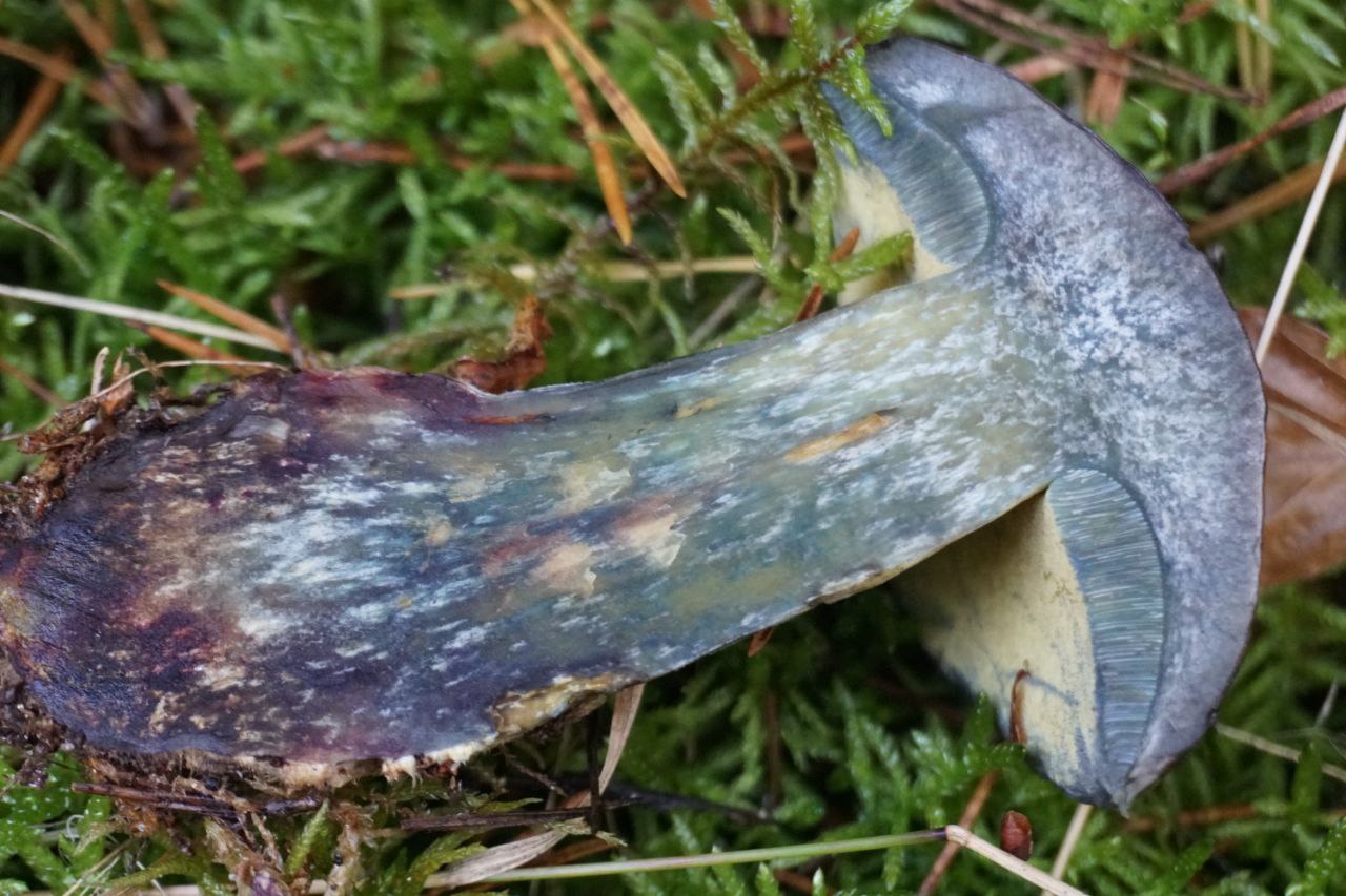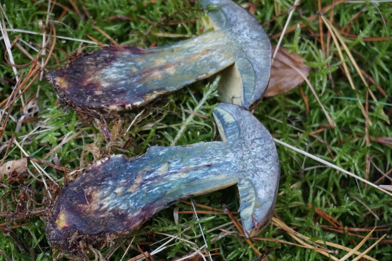 Der Hut war farblich nah an ner hellen Flockenhexe, der Stiel gelb und die Röhren auch. Besonders auffällig war das direkte Blauen bei Berührung und beim Längsschnitt. Ebenfalls die dunkle Rotfärbung an der Stielbasis.