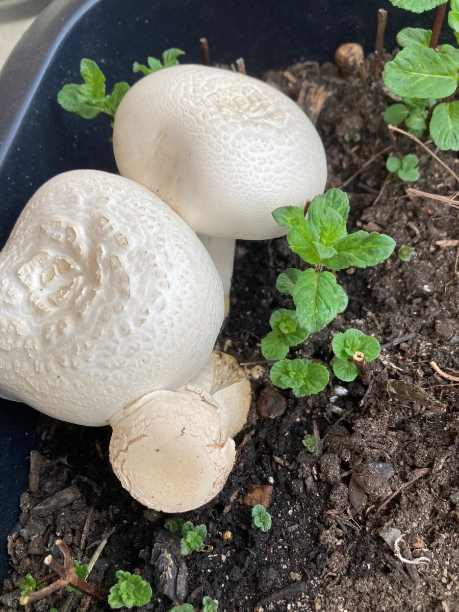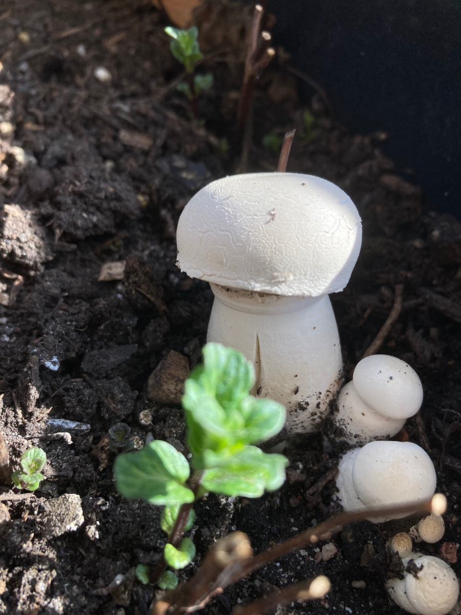 Ich habe in meinem kleinen Hochbeet Pilze. Normalerweise ist da nur Pfefferminze drinn.