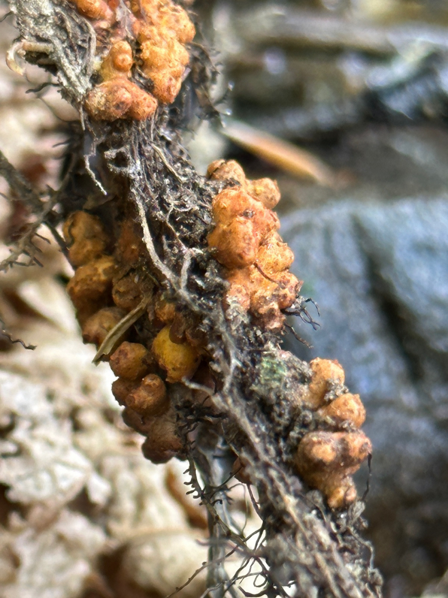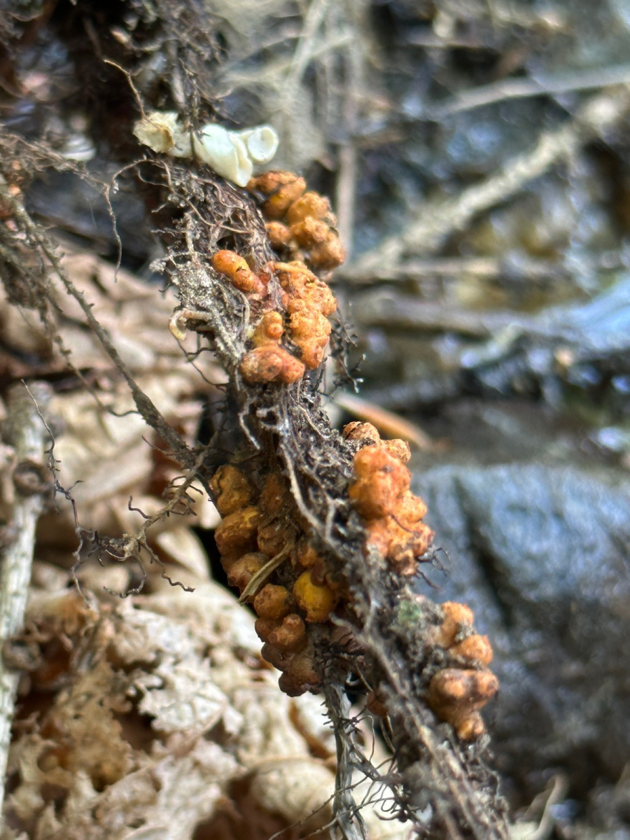 An einen Bachlauf habe ich Wurzelgeflecht mit Backenzahn-Kreislingen gefunden und weiter unten waren diese festen orangen „Kügelchen „ dran. Jedoch bin ich etwas Ratlos um was es sich da handeln kann. Schon mal vielen Dank für eure Mithilfe.