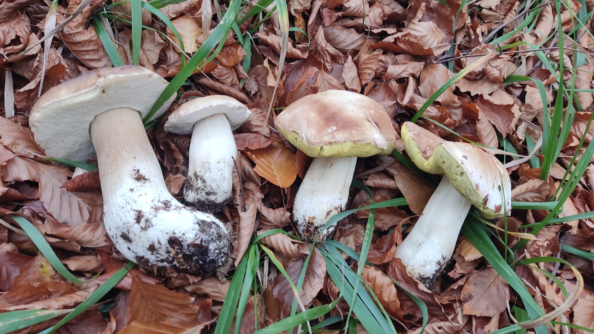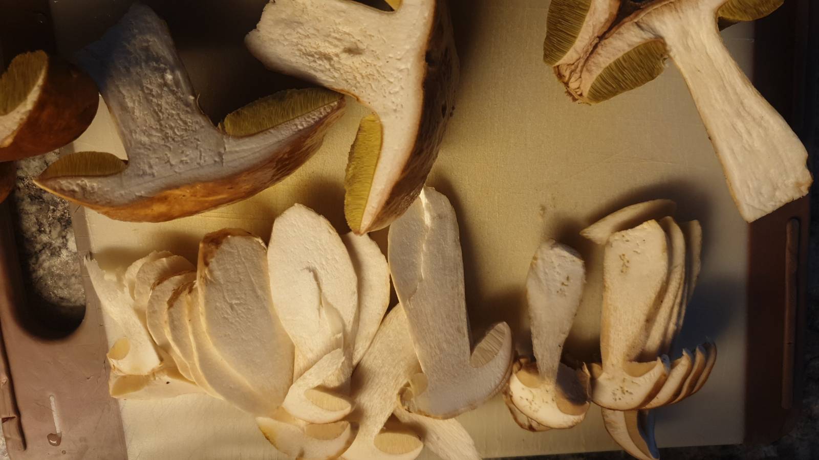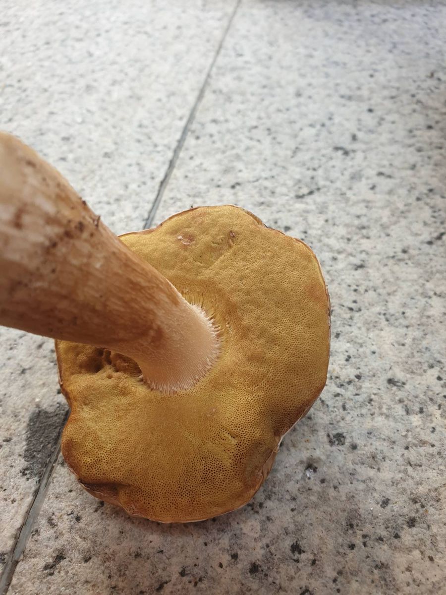 Heute hat eine Freundin Fotos geschickt und mich gefragt, ob das ein Steinpilz ist. Ihre tschechischen Arbeiter waren im Wald, die Farbe der Poren hat sie misstrauisch gemacht. Hab sie dann gebeten, die Pilze durchzuschneiden, alle olivgrünen und weißen haben sich nicht verfärbt, die mit den gelben Poren wurden grau - ich kenn das so nicht. Weiß weder Habitat noch hab ich andere Fotos. Danke für jeden Tip!
