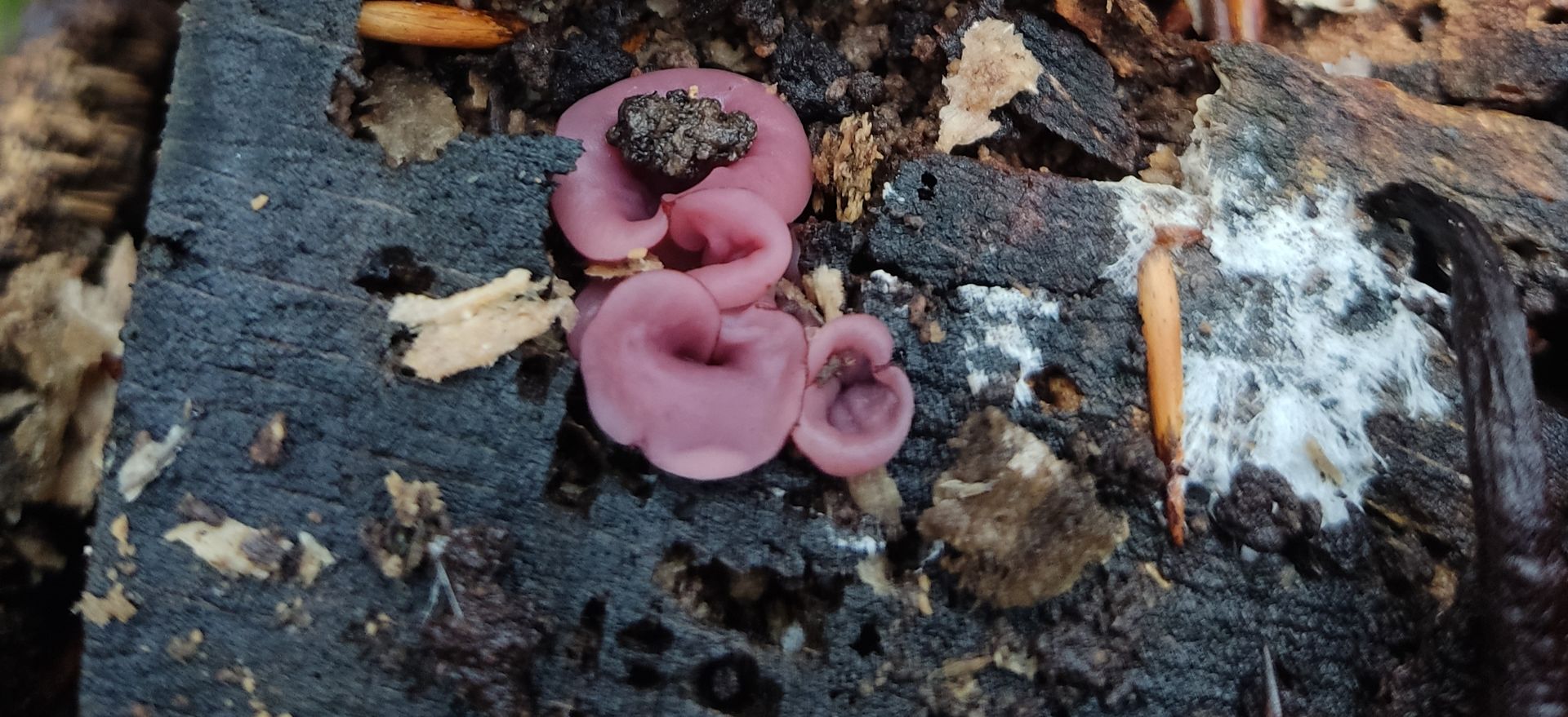 Am Weg dorthin geselliges Beisammensein von Ziegelroten? Schwefelköpfen und Violetten Gallertbecherchen.